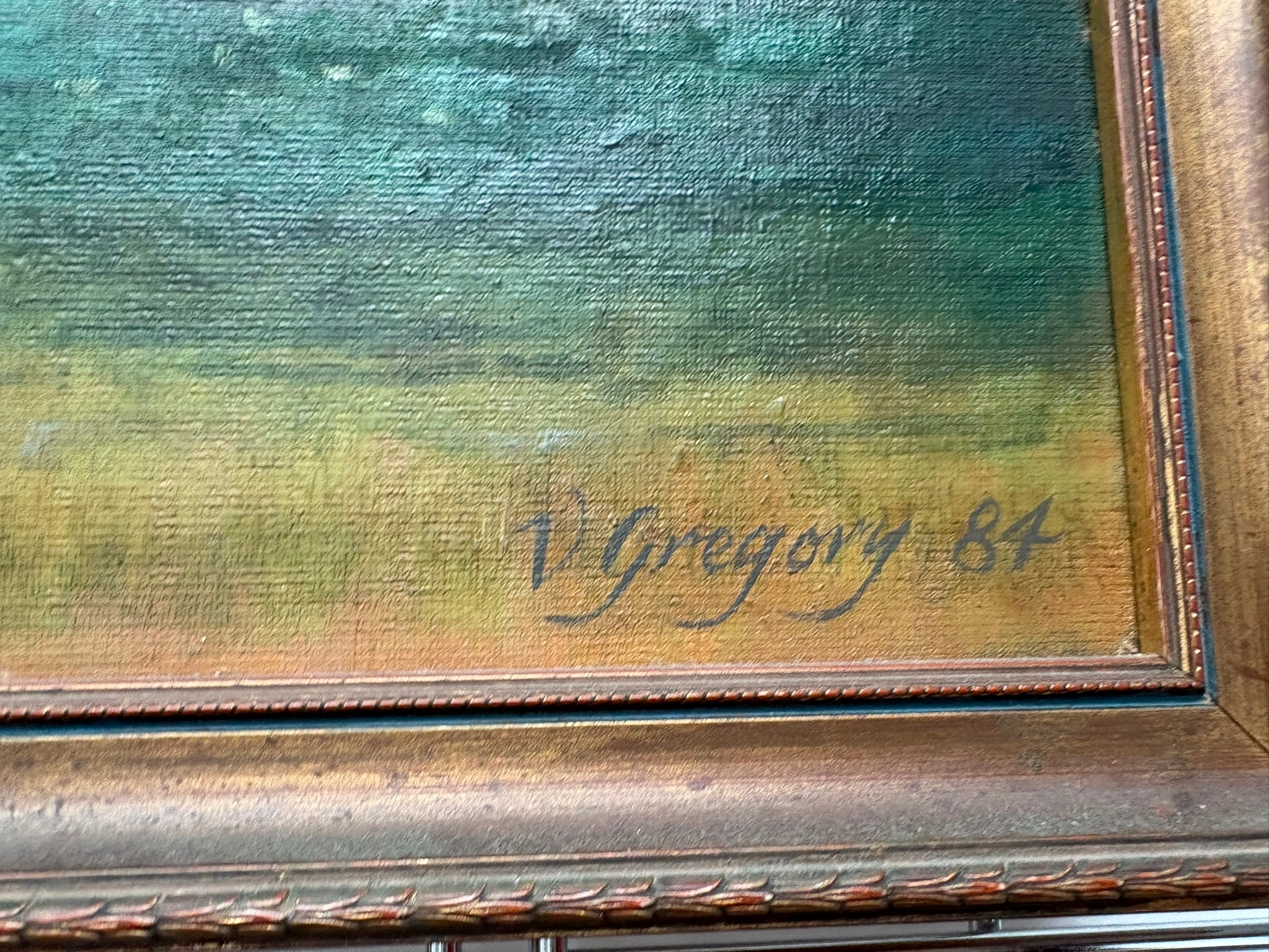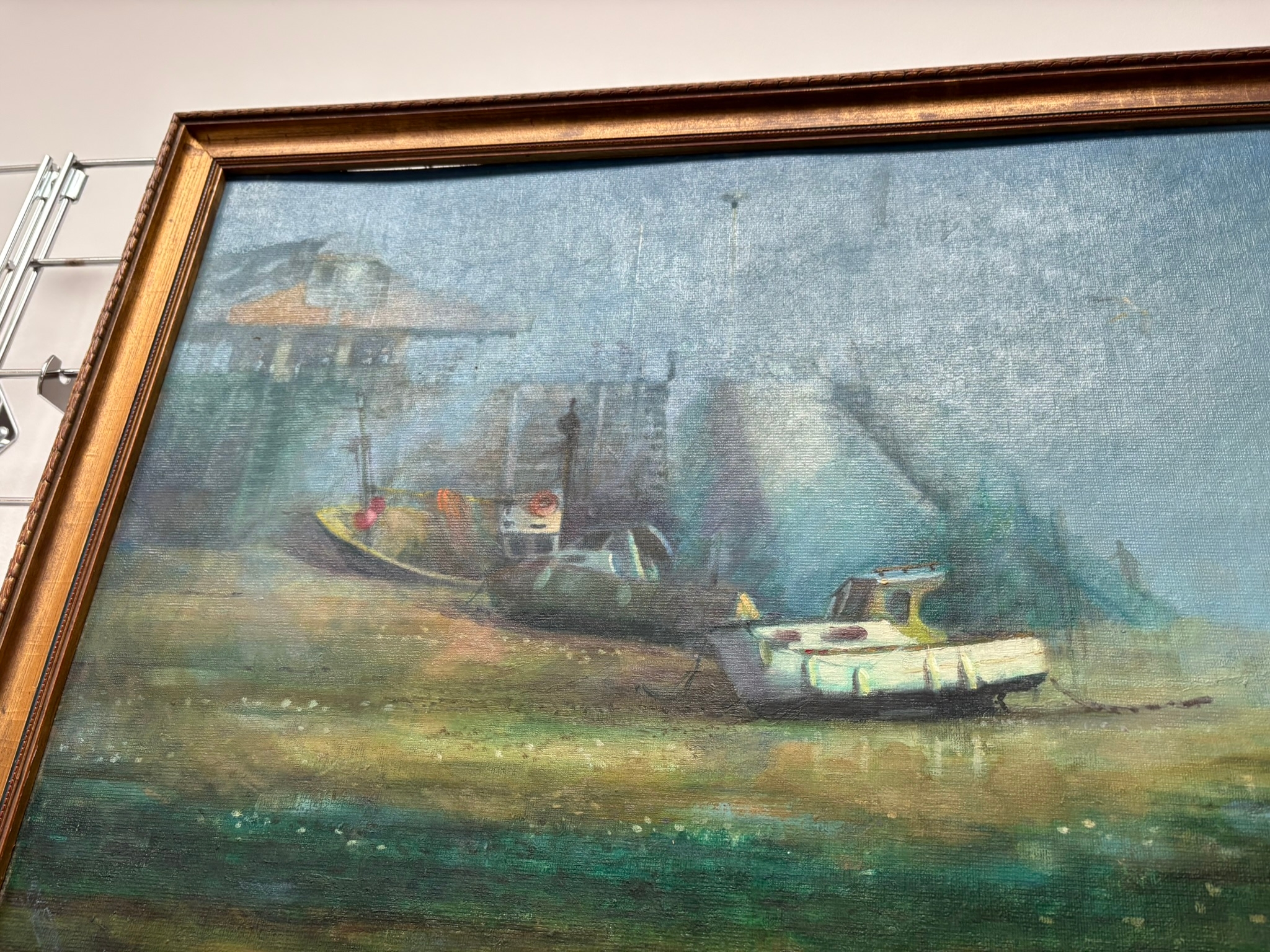 Oil on board of boats in harbour signed V. Gregory 84
