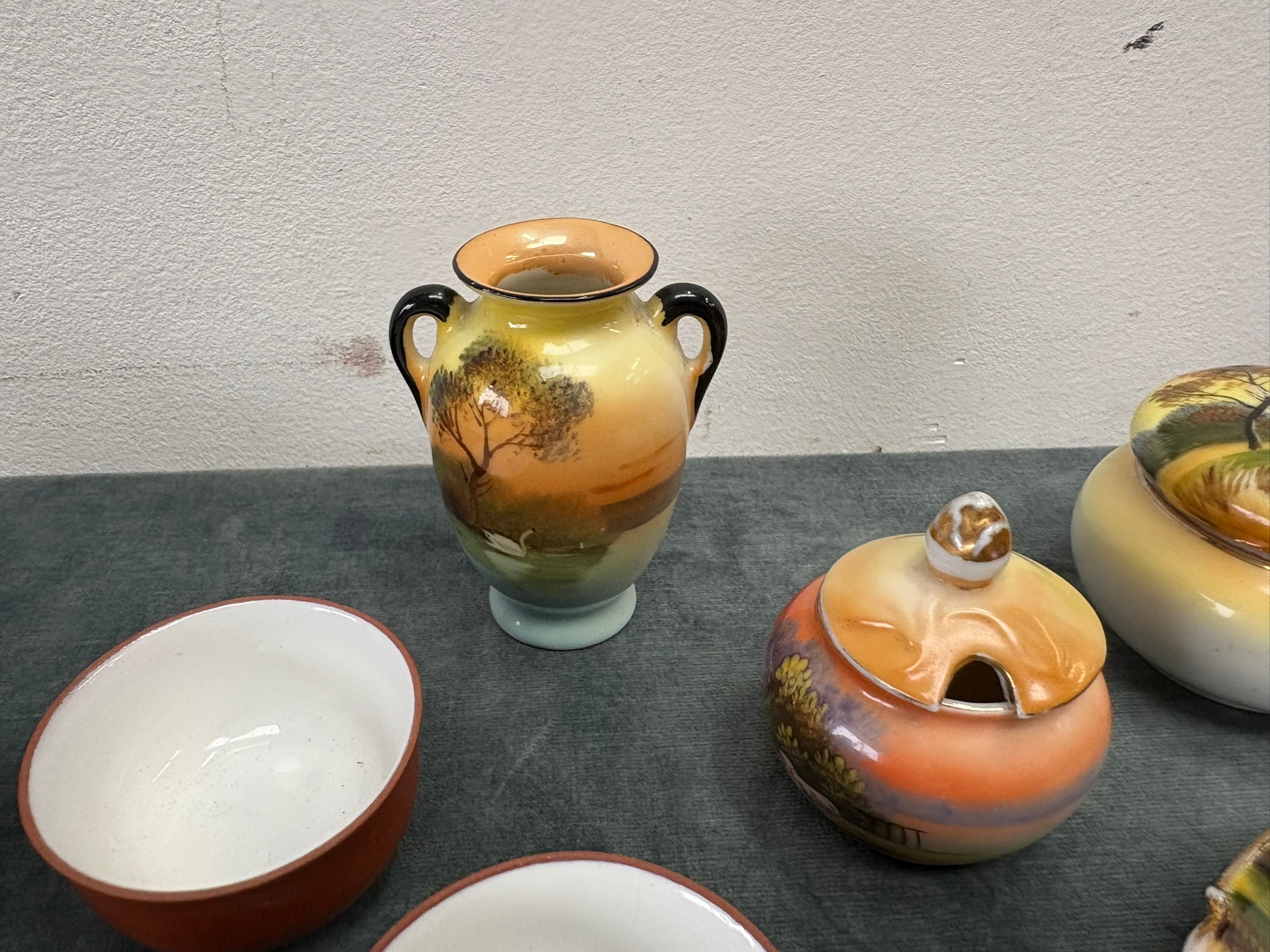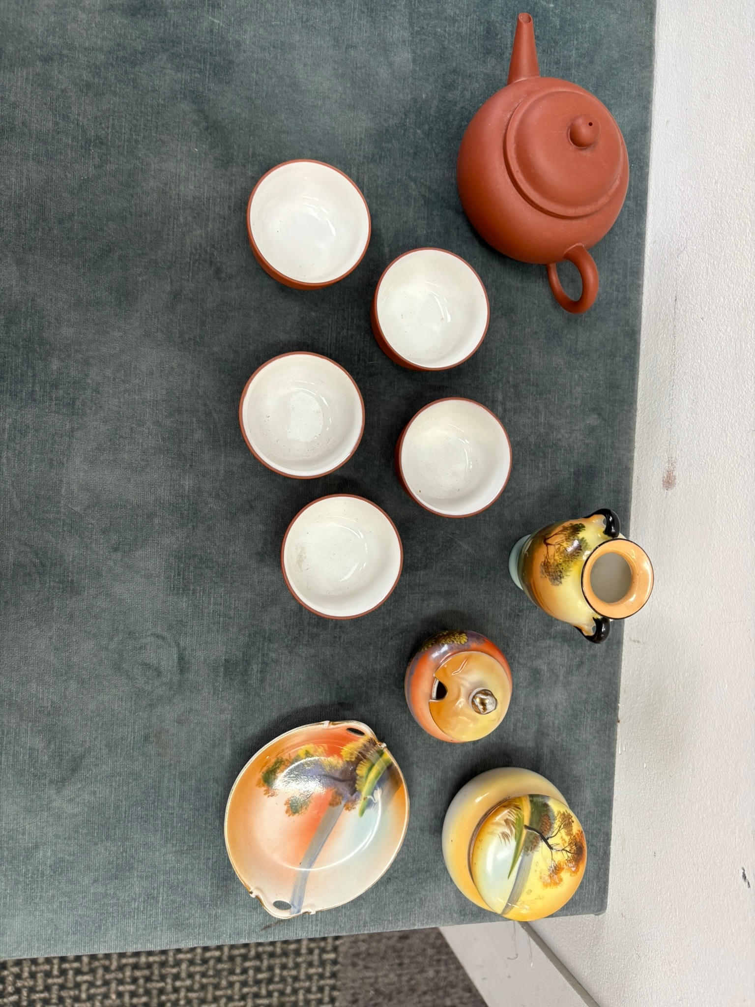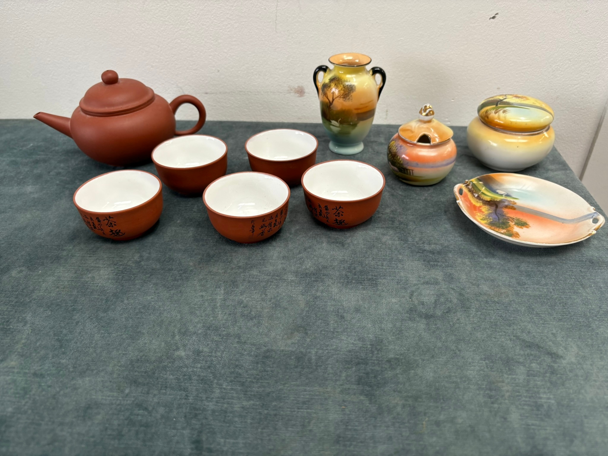 Oriental teapot and 5 cups and Noritake Japanese lidded pots and vase