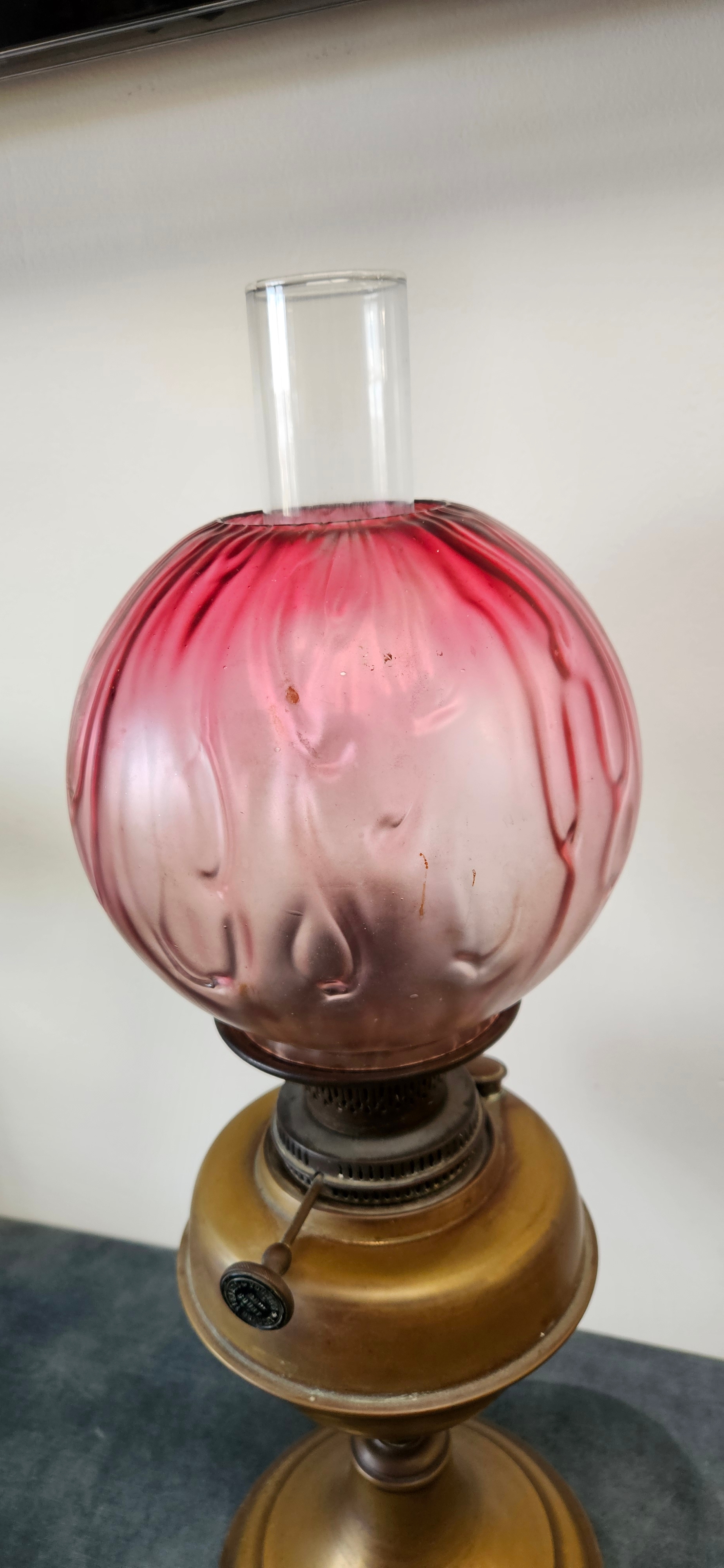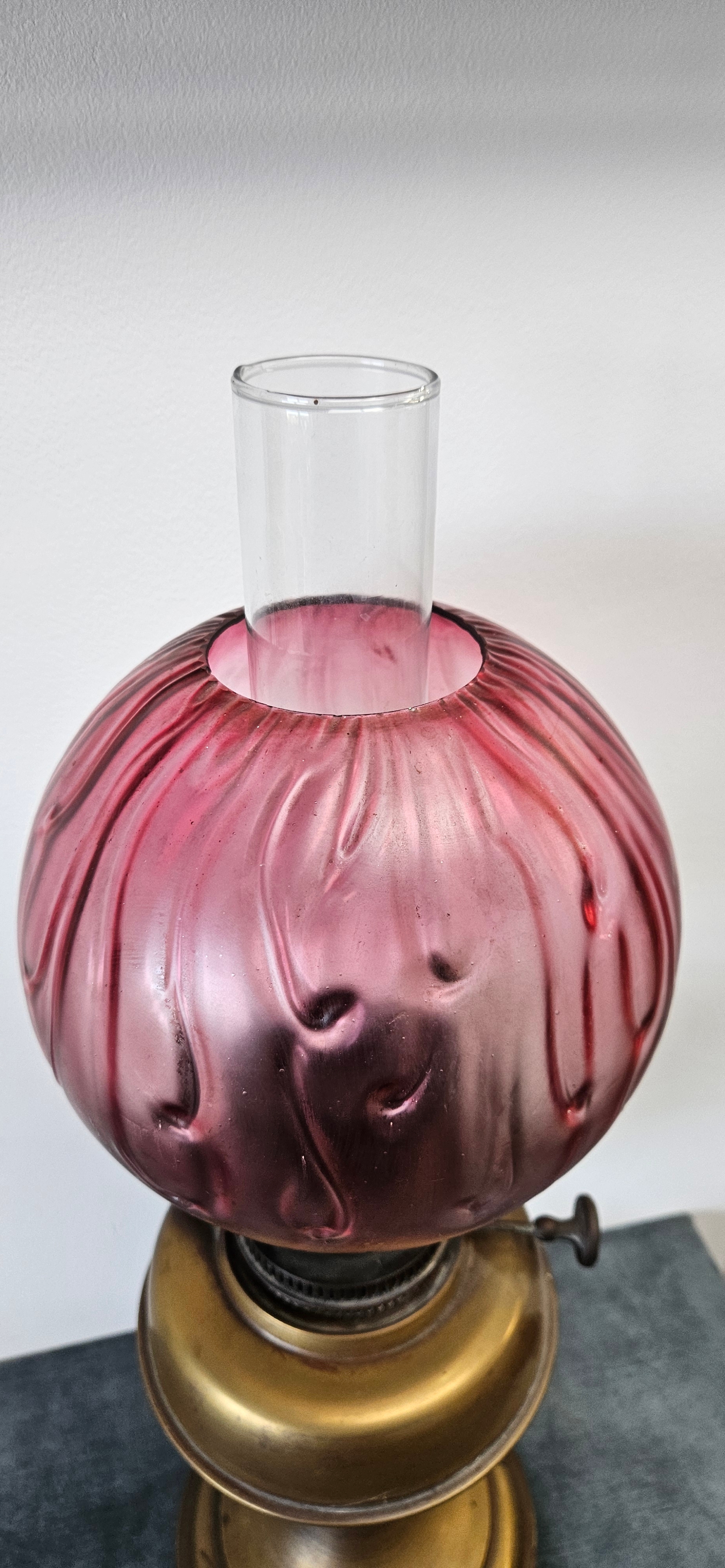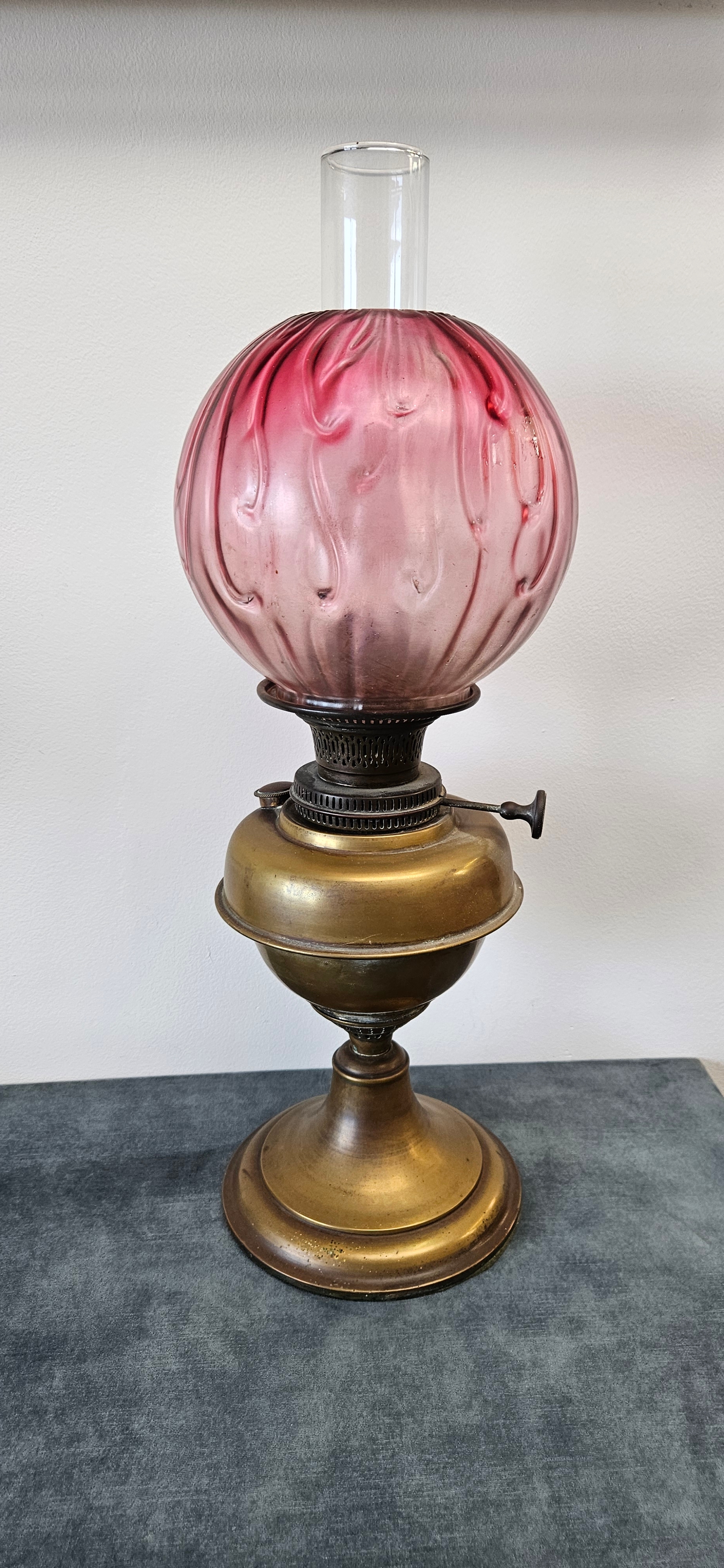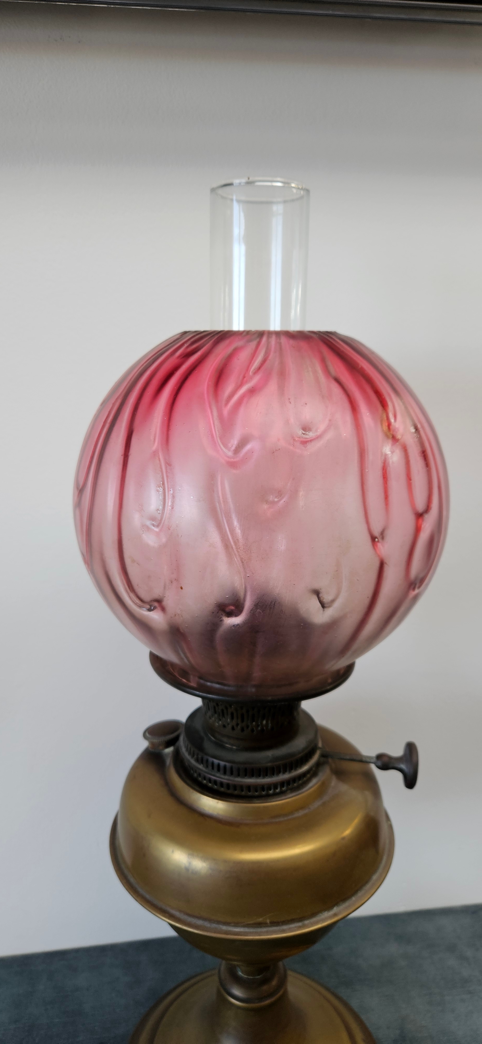 Antique Victorian brass oil lamp with a cranberry glass shade.