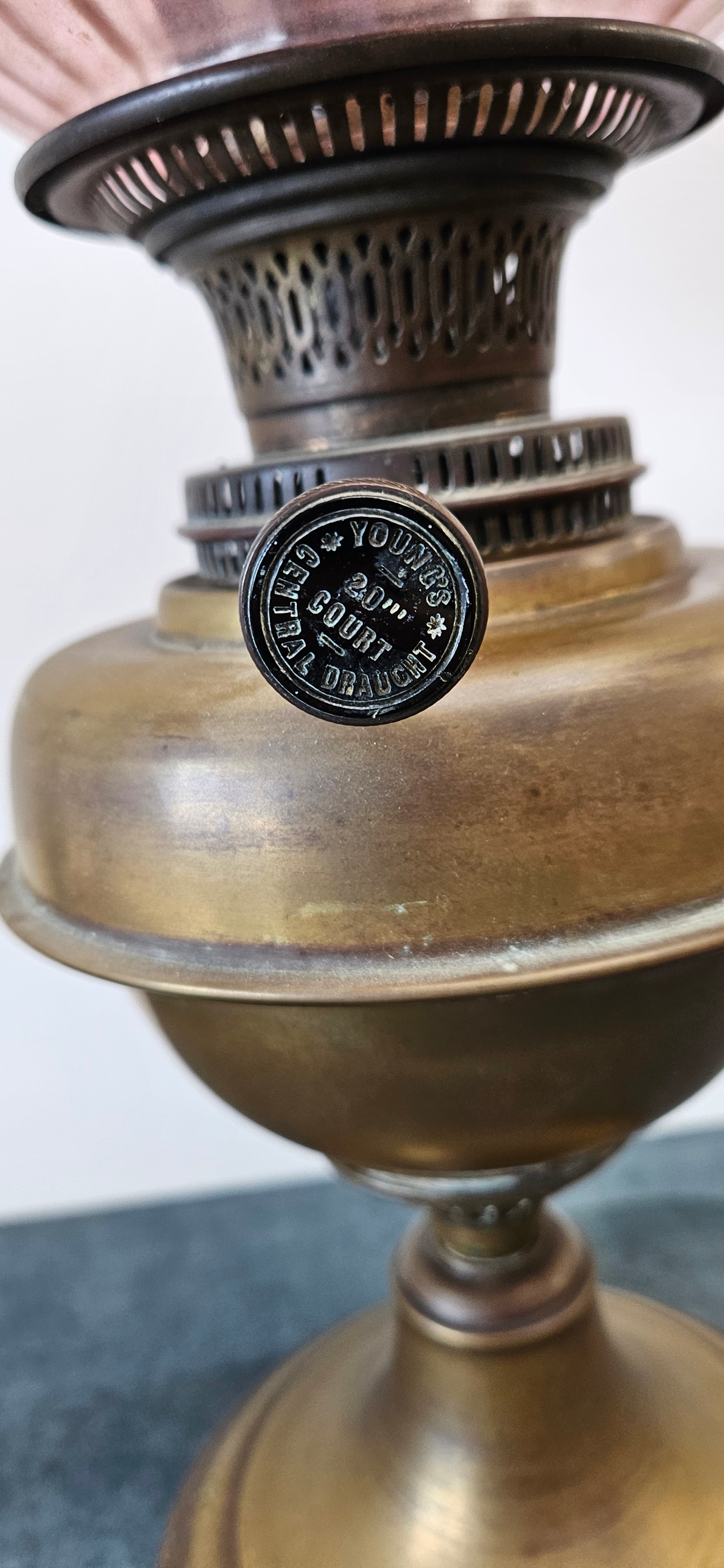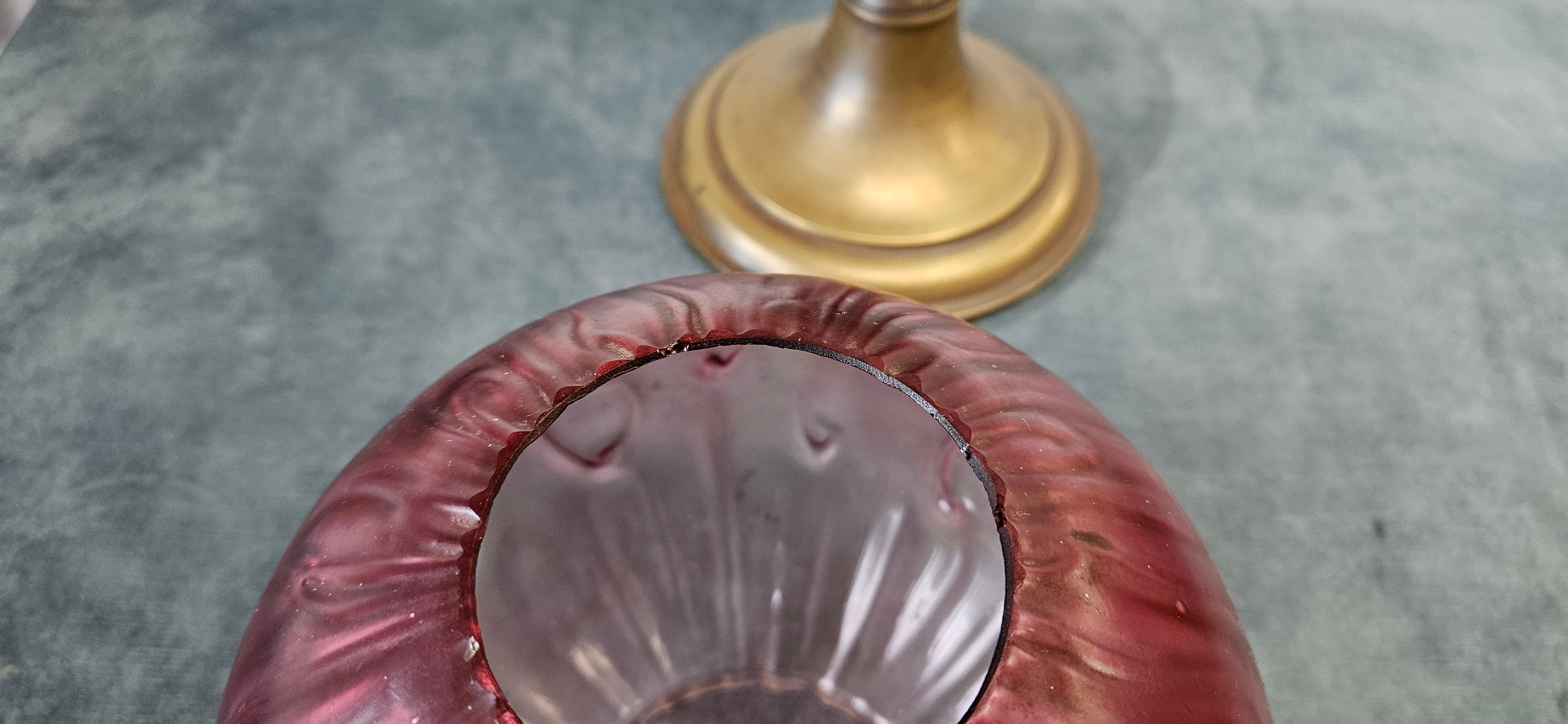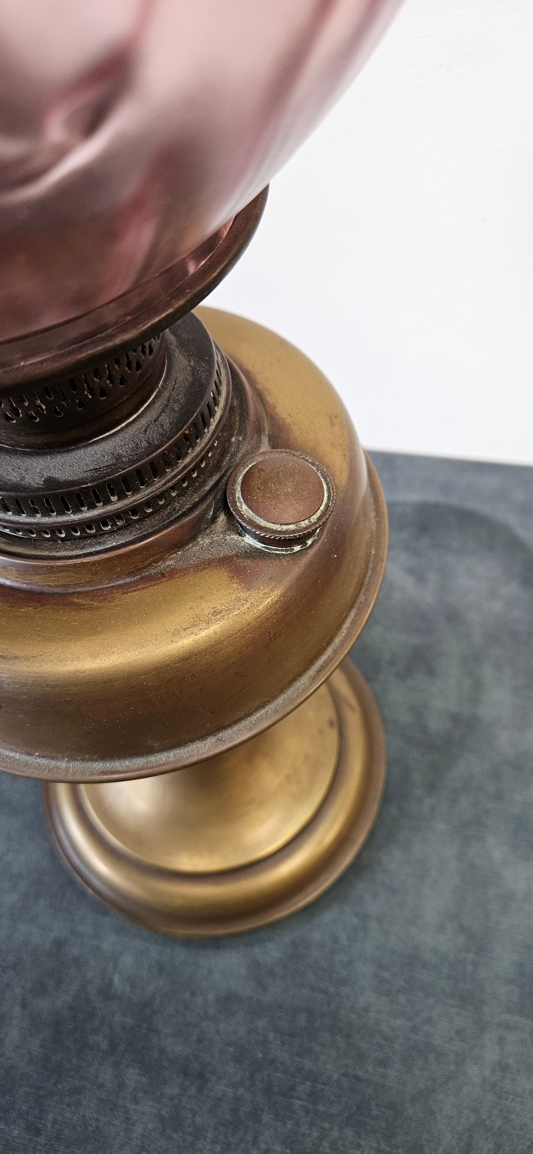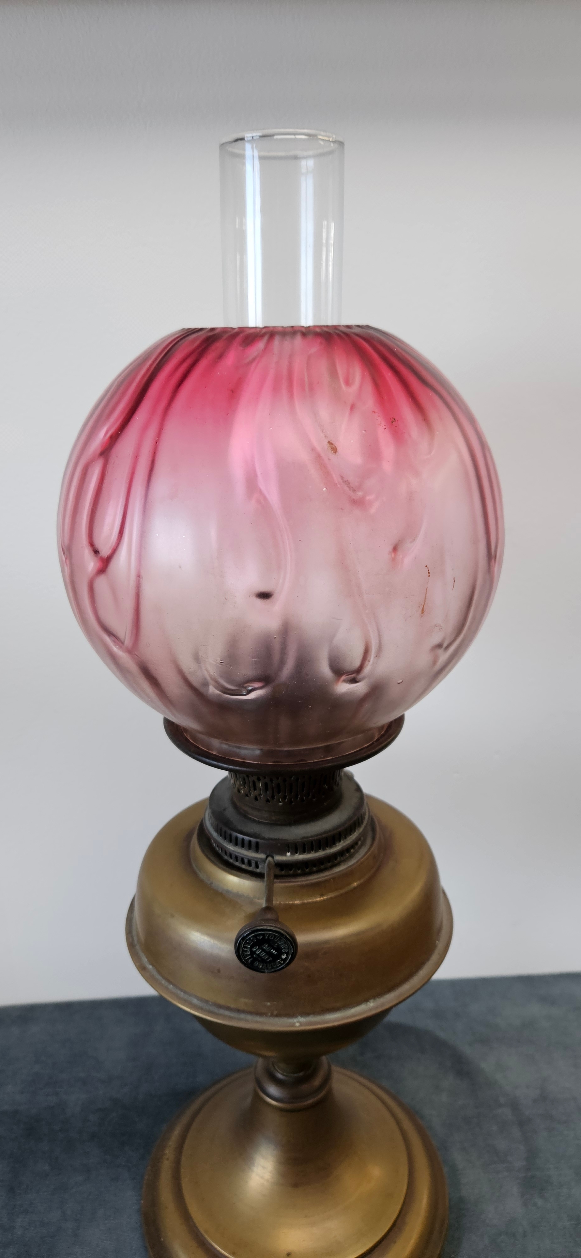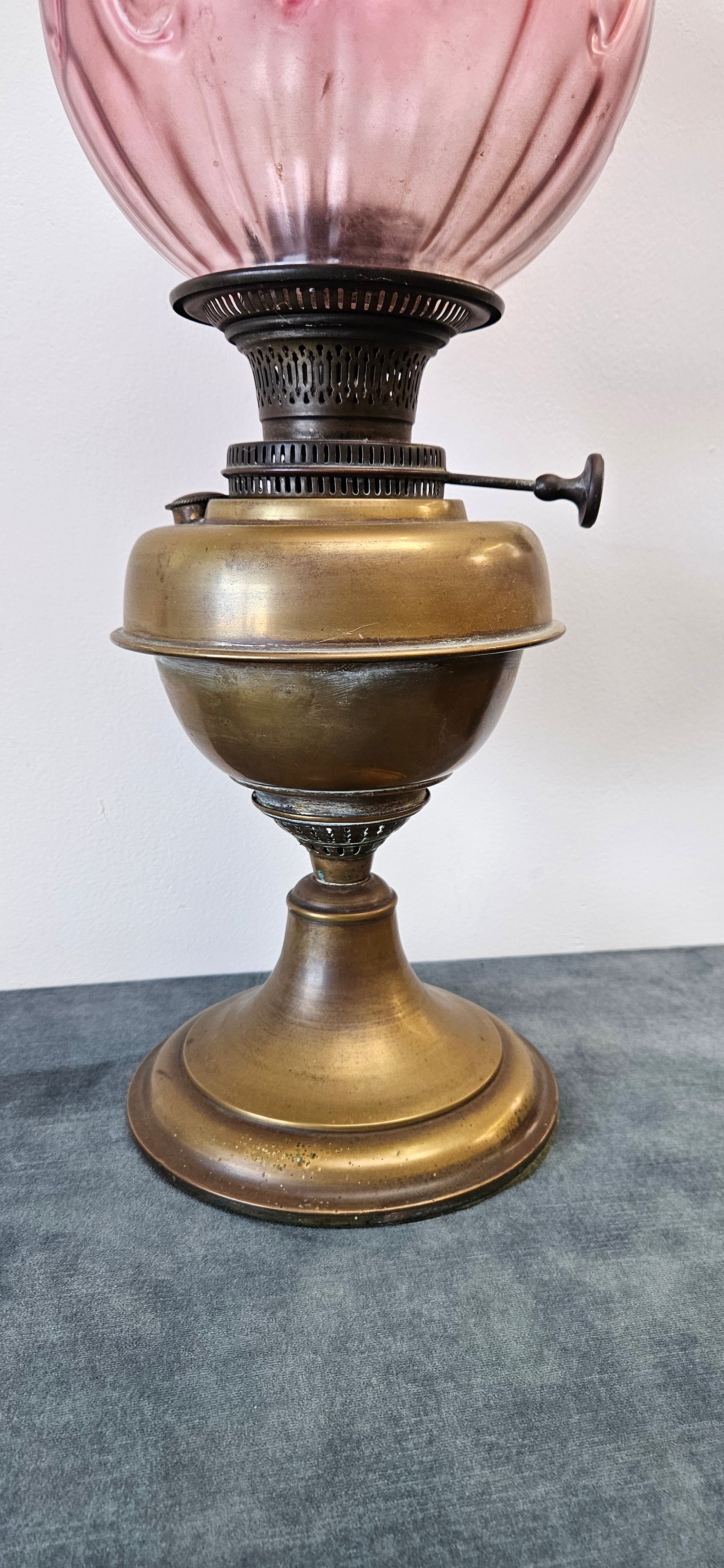 Antique Victorian brass oil lamp with a cranberry glass shade.