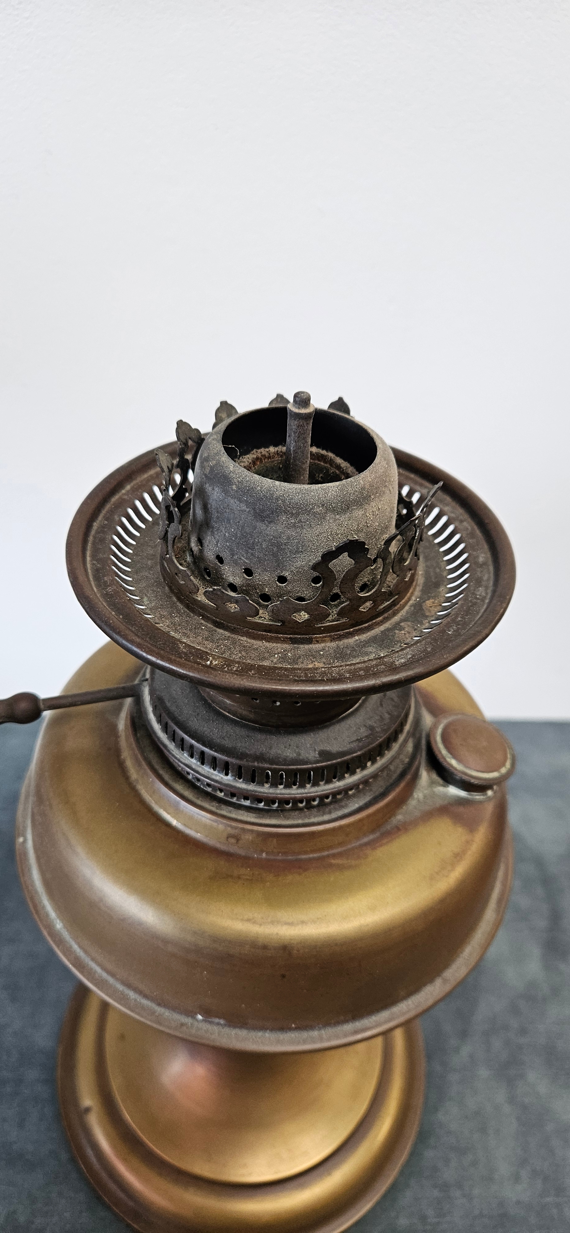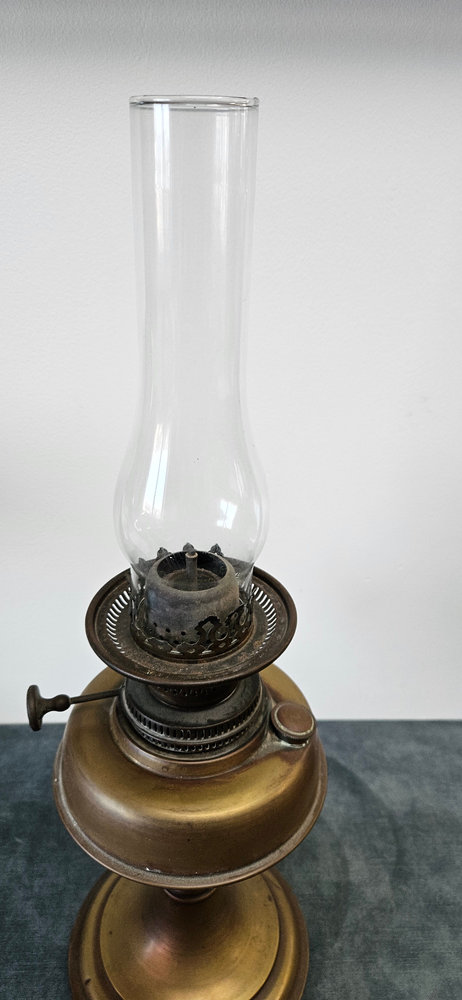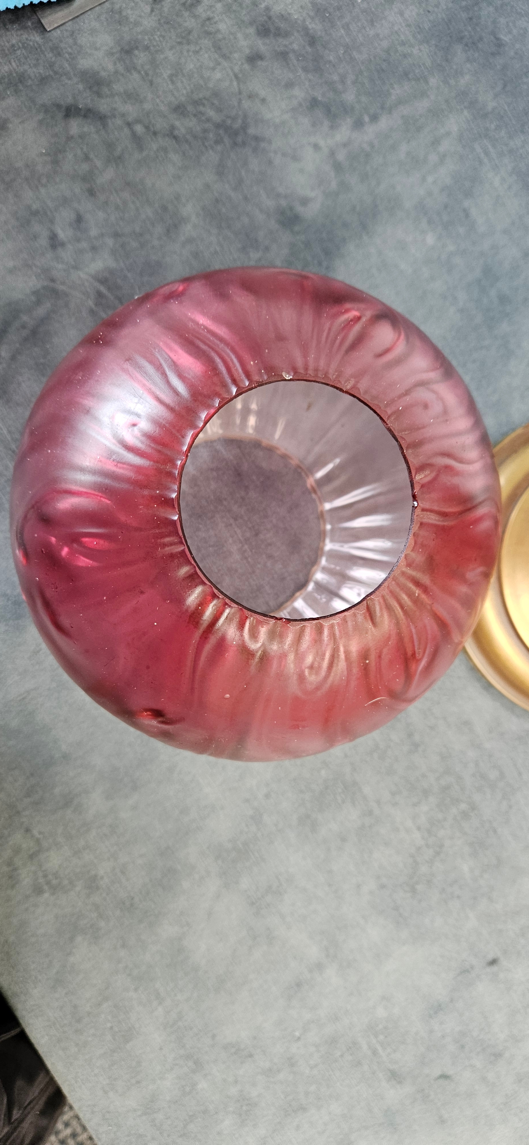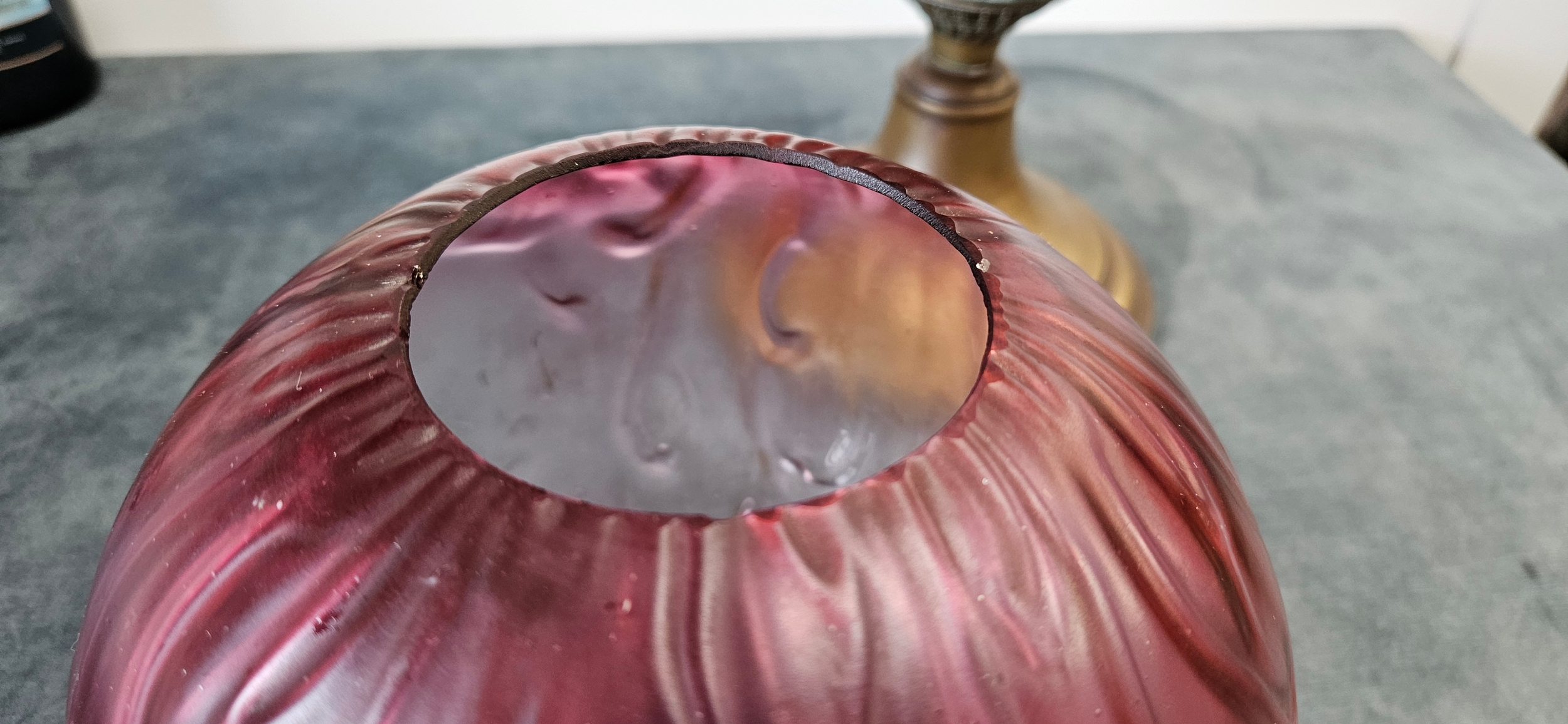 Antique Victorian brass oil lamp with a cranberry glass shade.