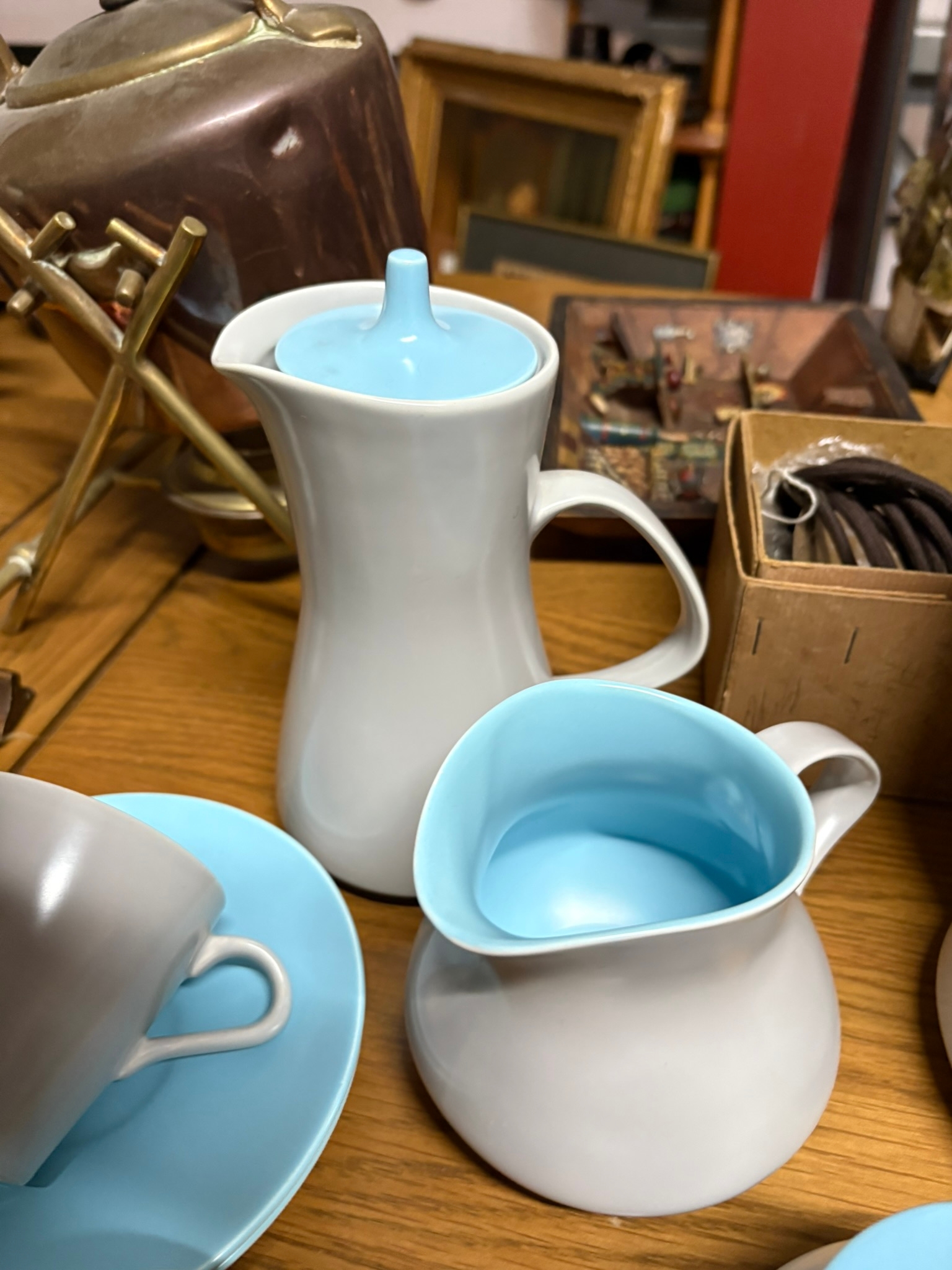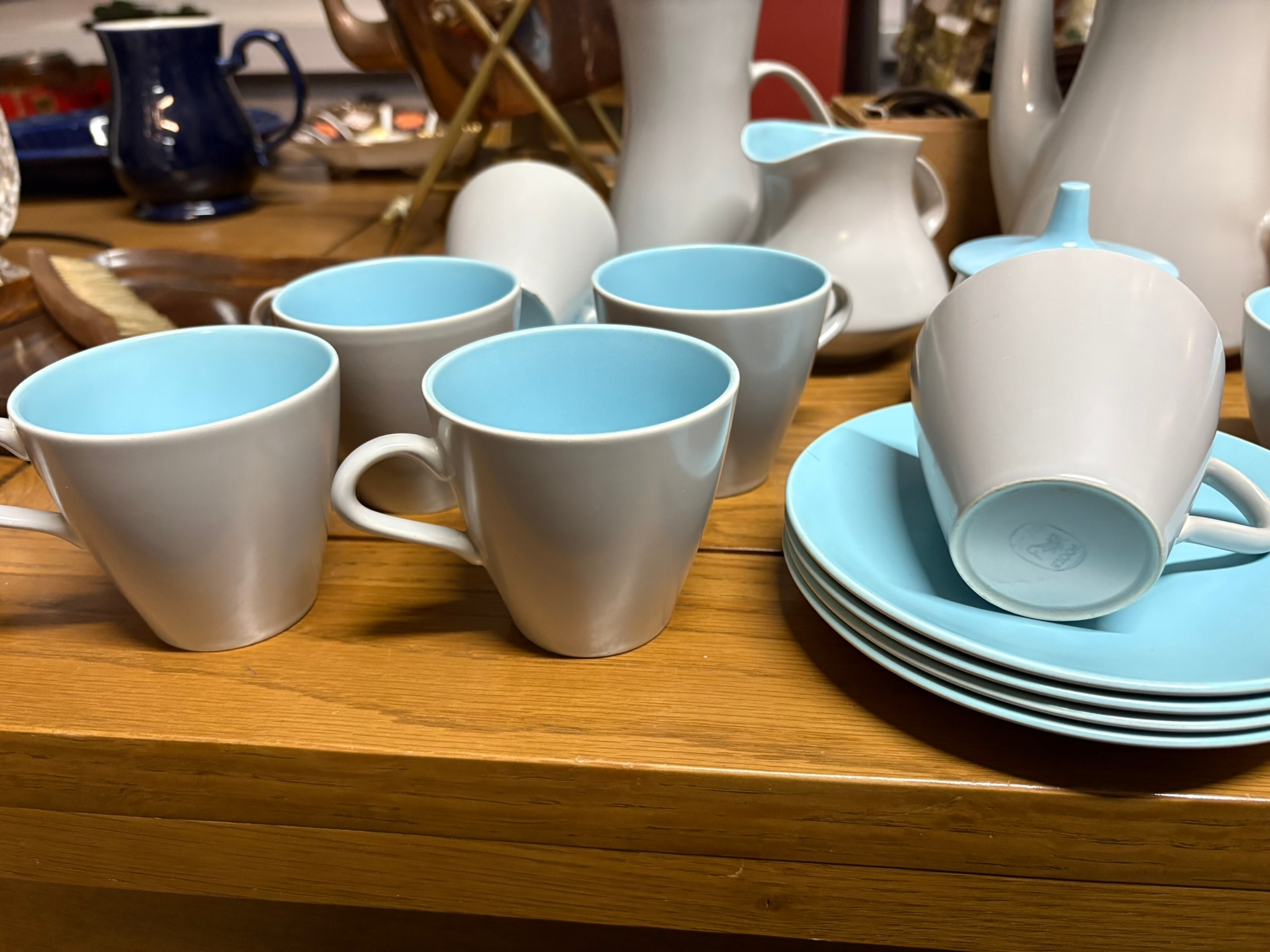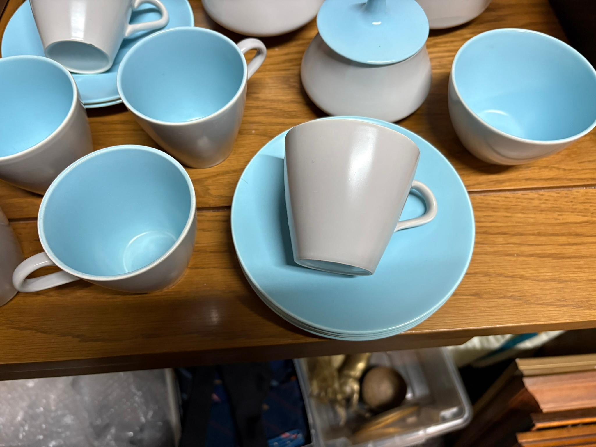 Poole pottery twin tone blue and grey tea set including teapot, 2 x jug, sugar bowl and 6 cups and saucers