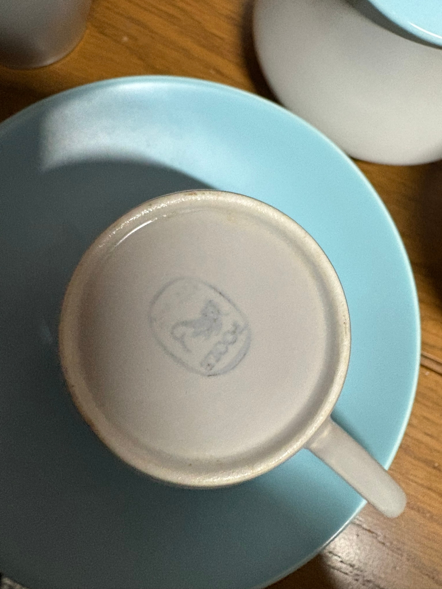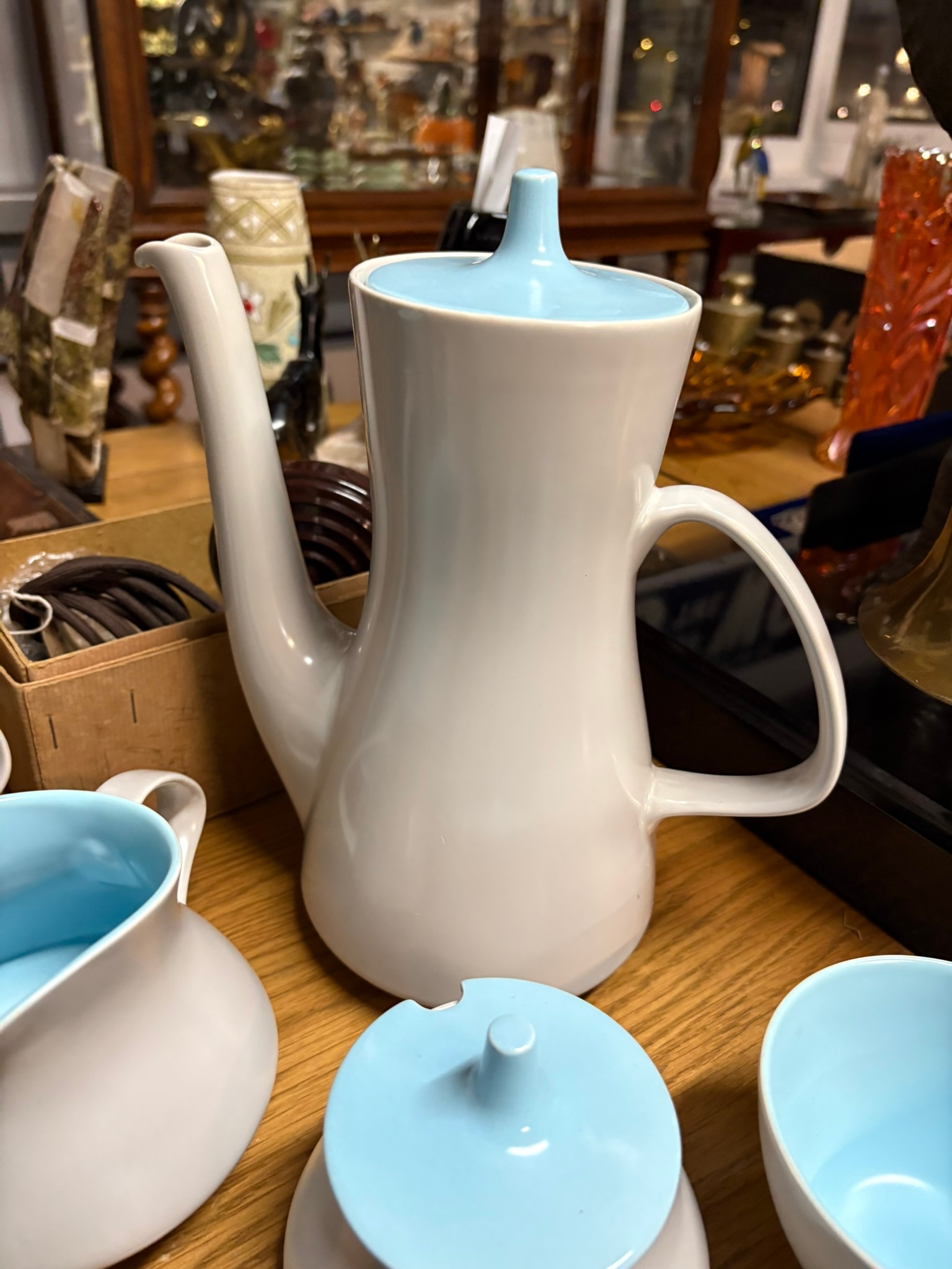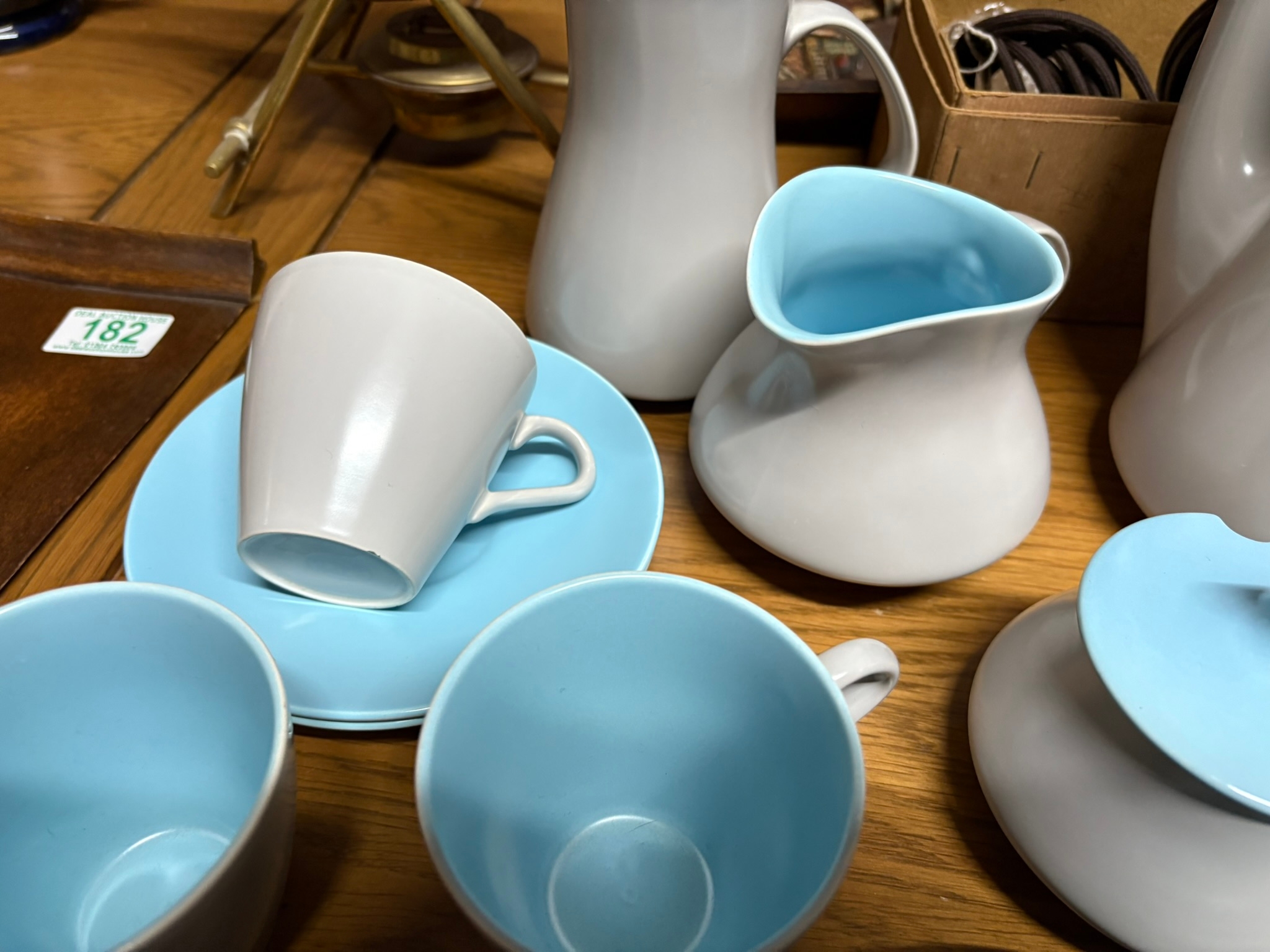 Poole pottery twin tone blue and grey tea set including teapot, 2 x jug, sugar bowl and 6 cups and saucers