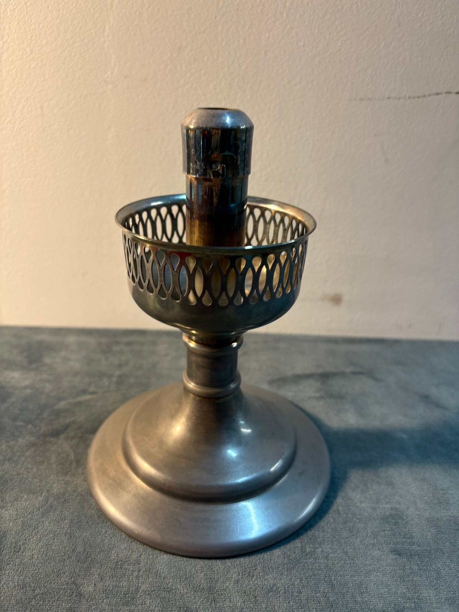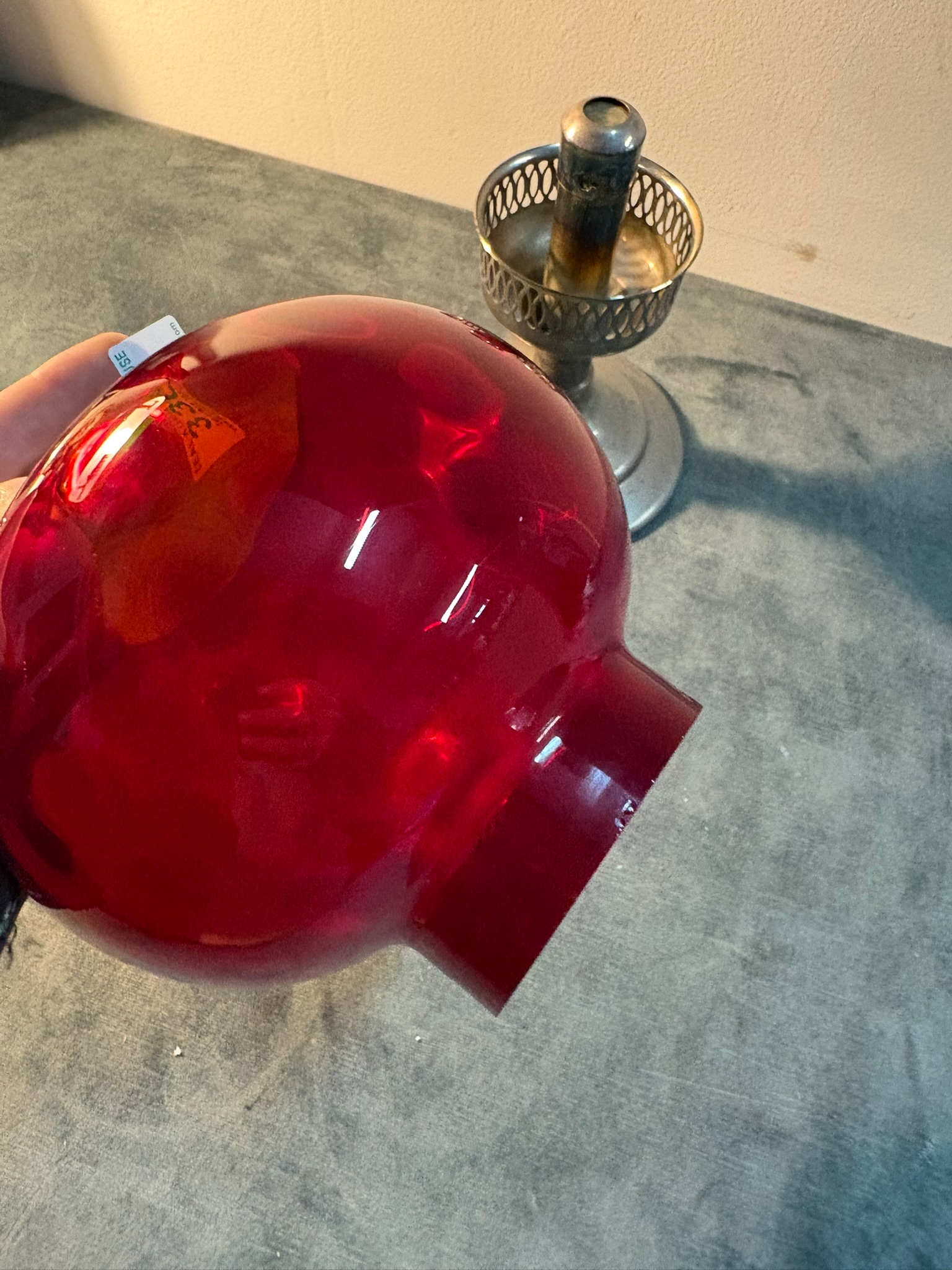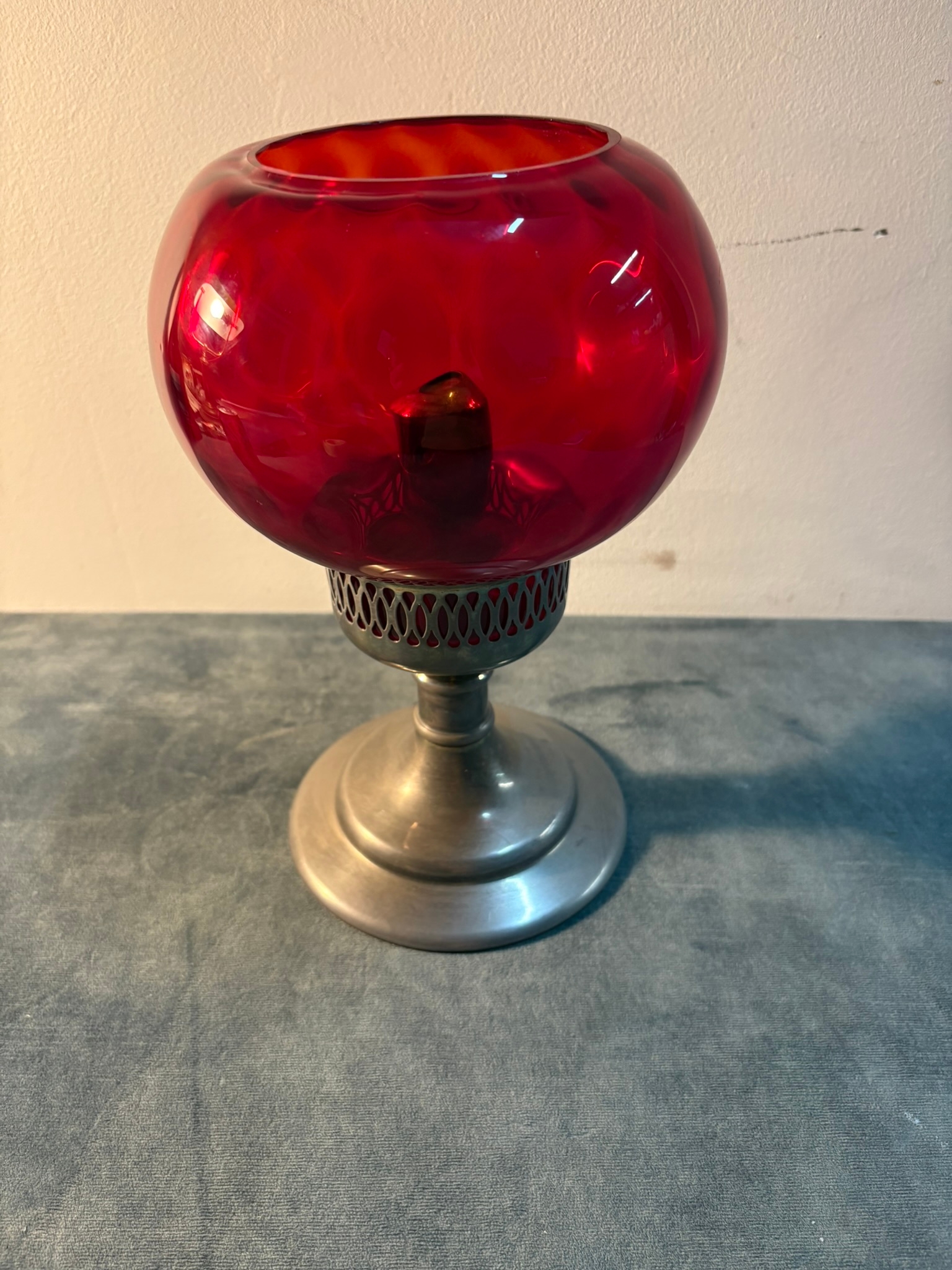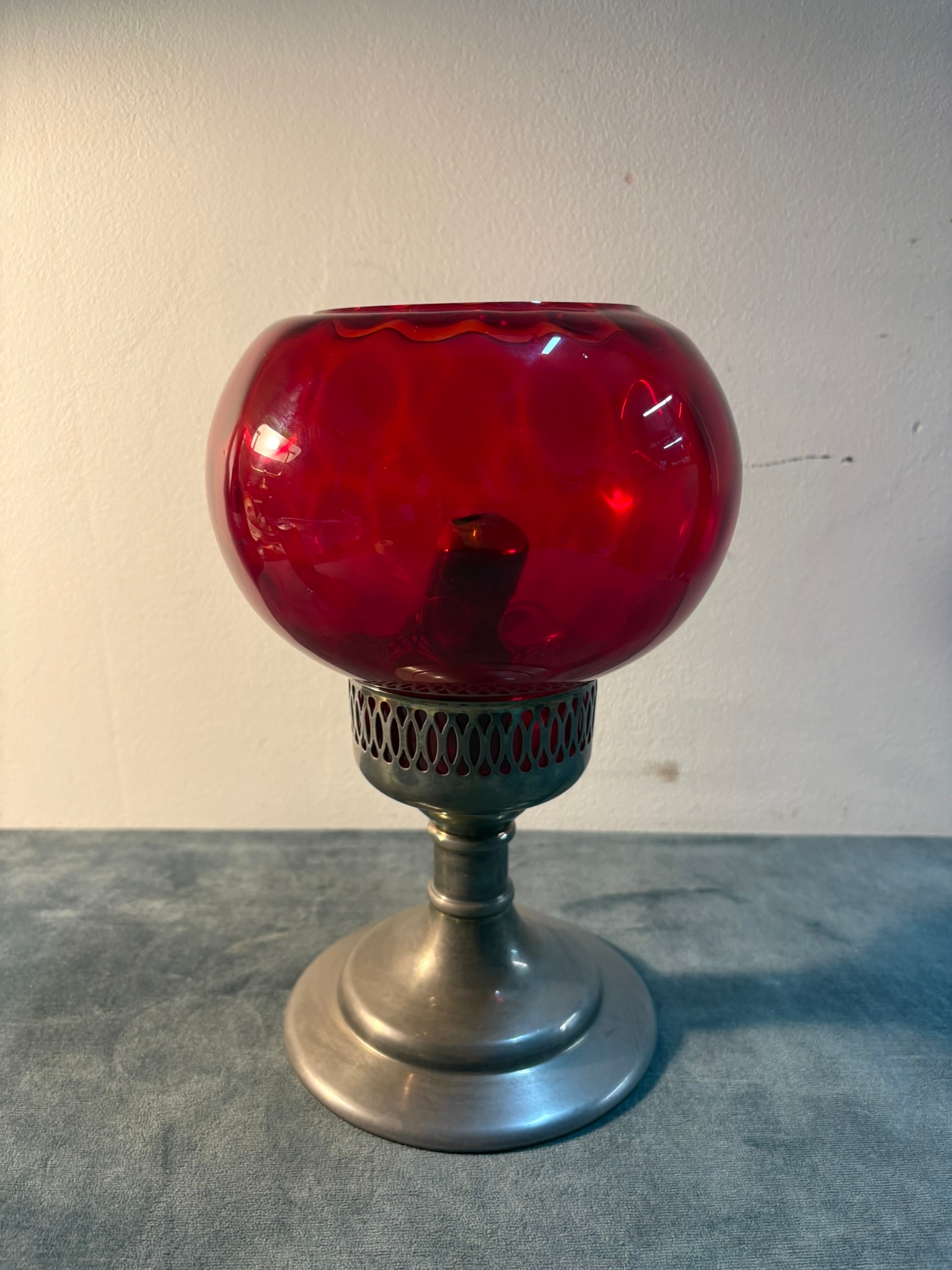 Small red glass and metal candlestick
