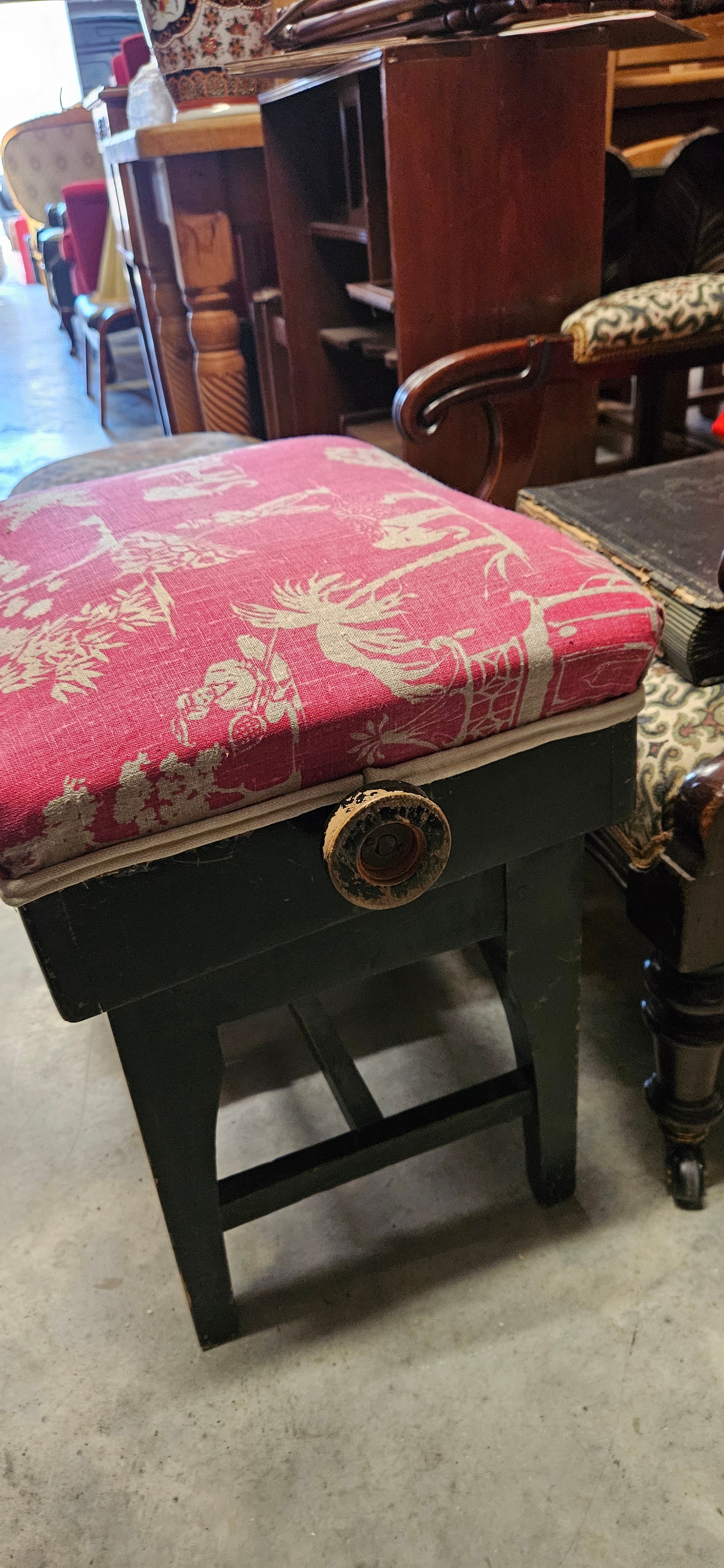 Upholstered black painted rise and fall piano stool