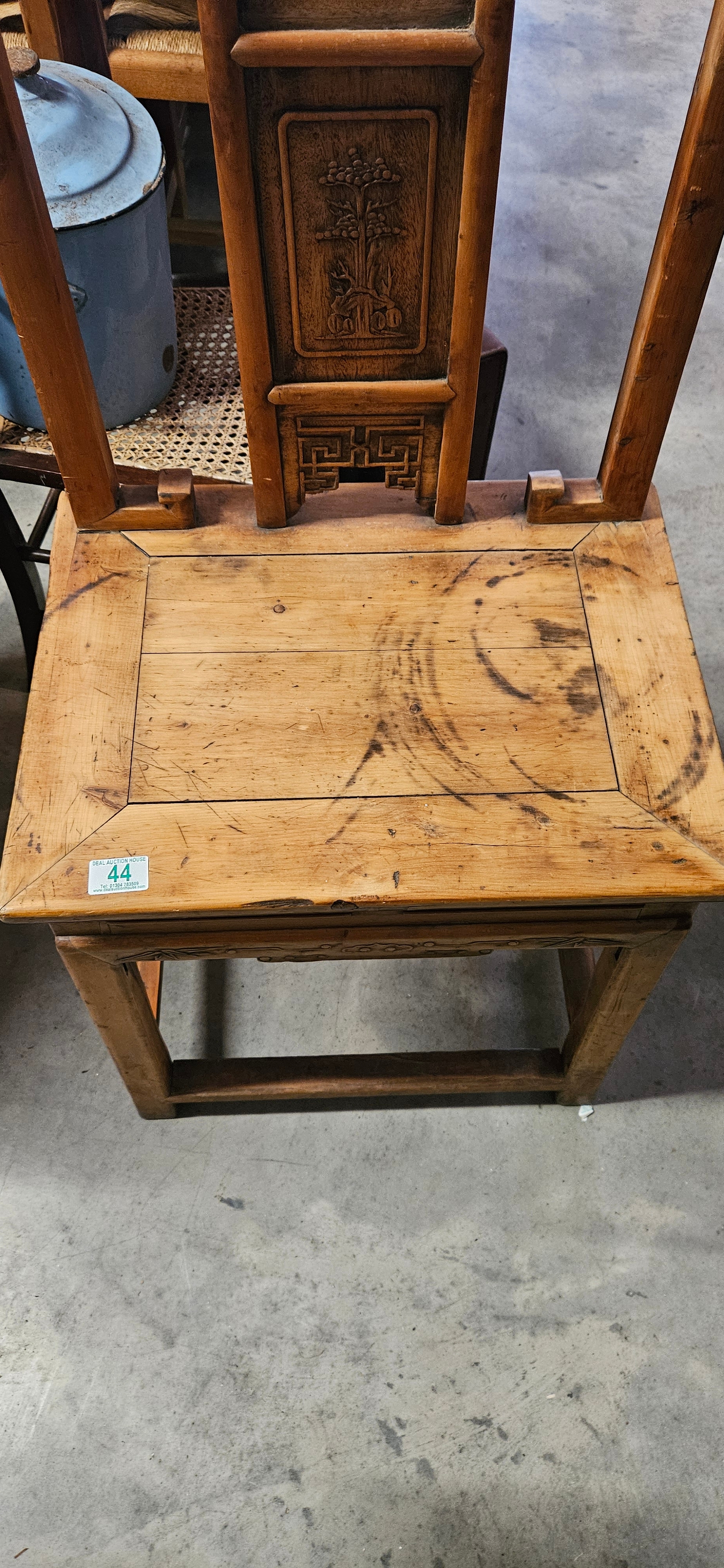 Antique Chinese elm scholars chair with carved Chinese motifs