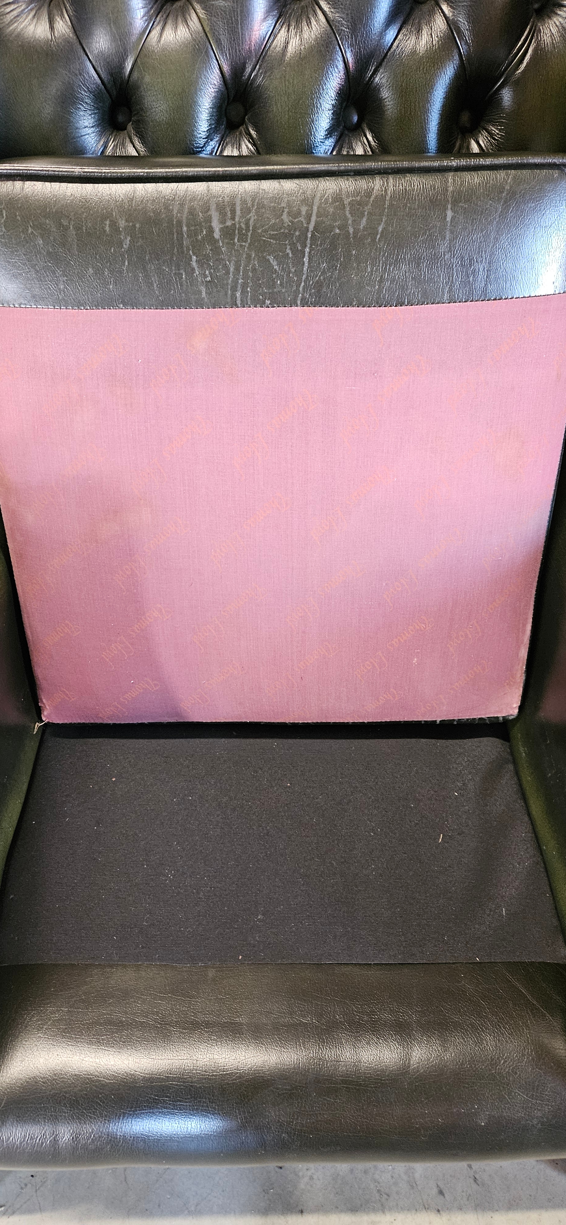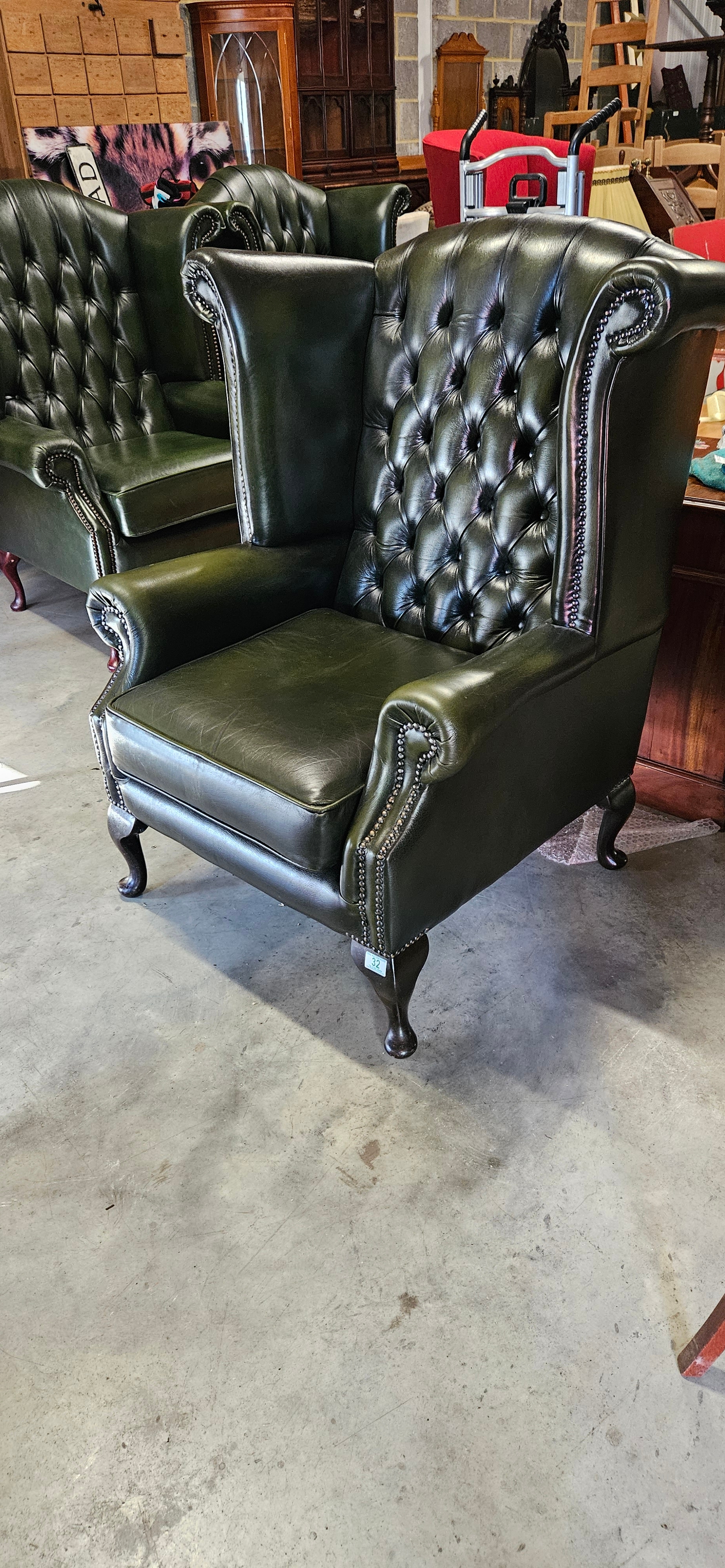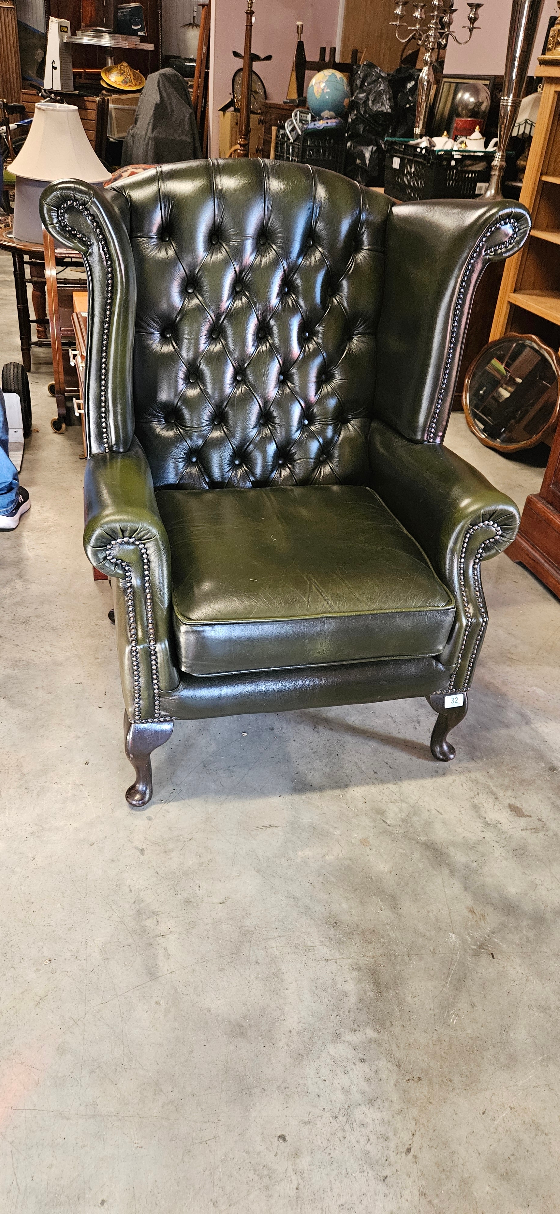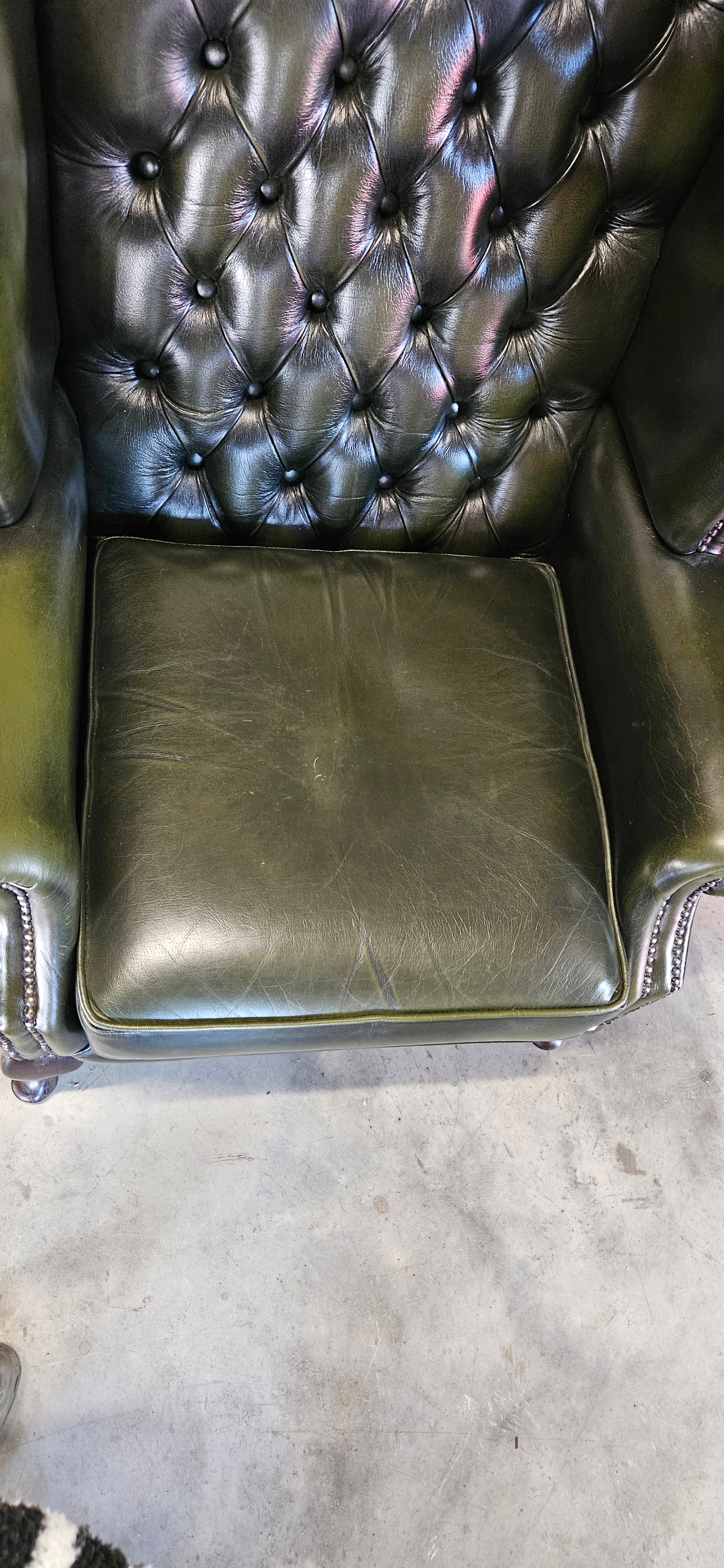 Chesterfield Queen Anne style high-back wing chair in antique green leather – Thomas Lloyd – good condition