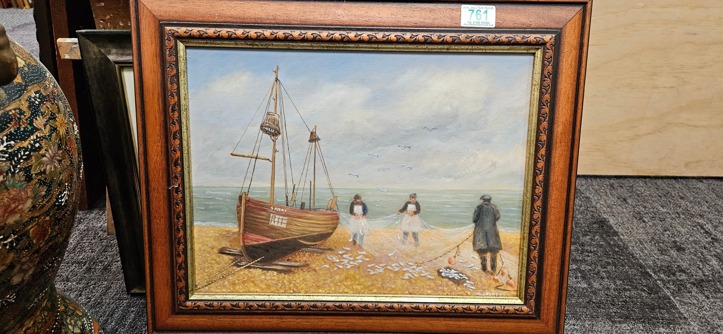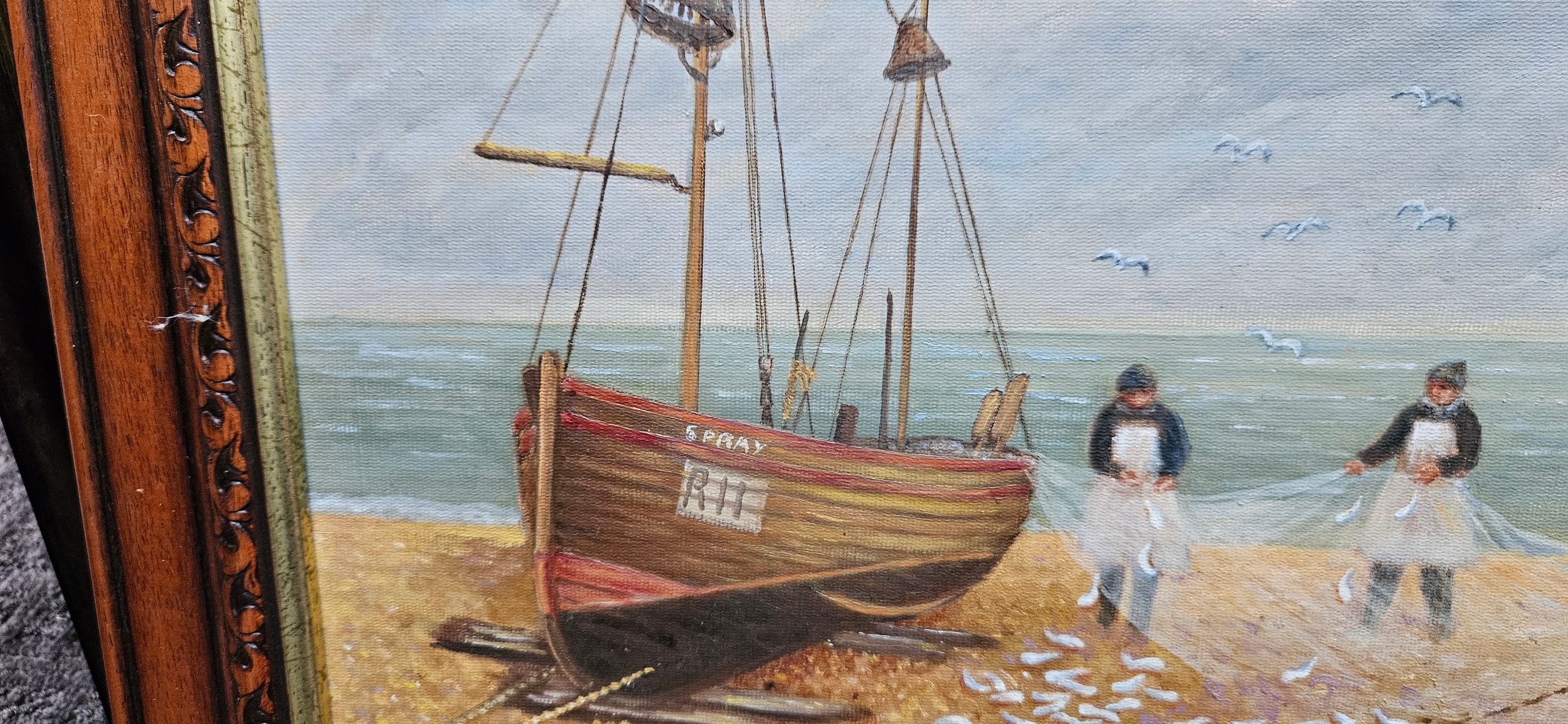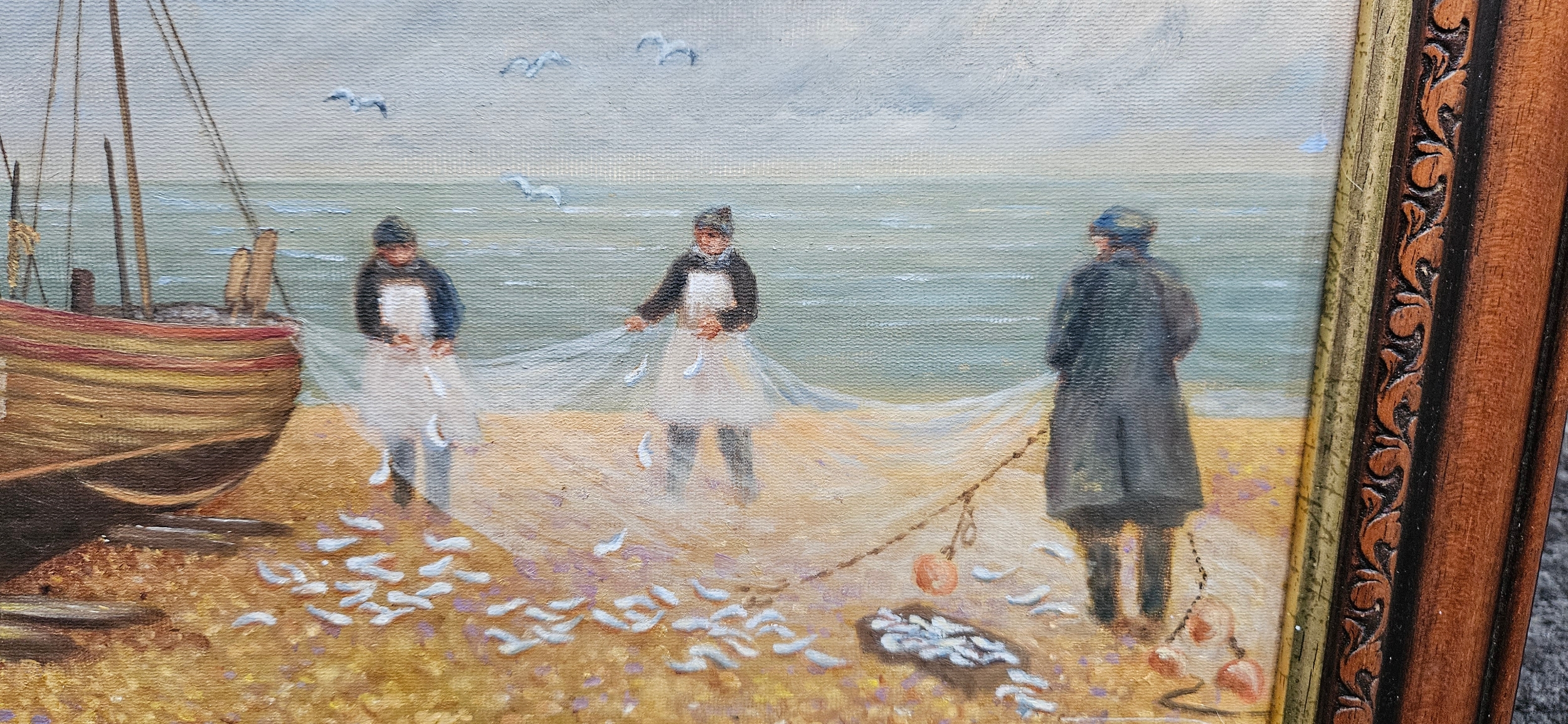Oil on board painting depicting a seascape with a fishing boat and fishermen.