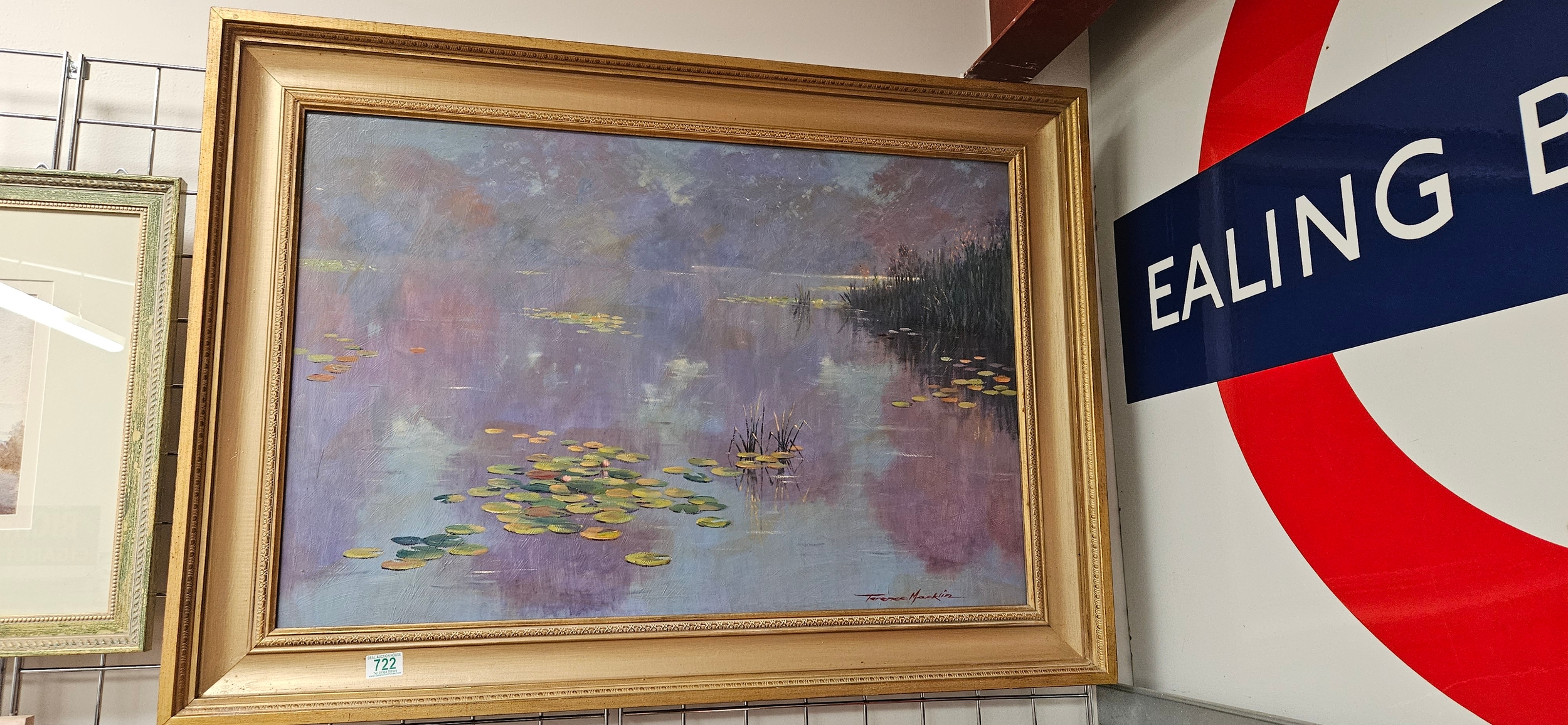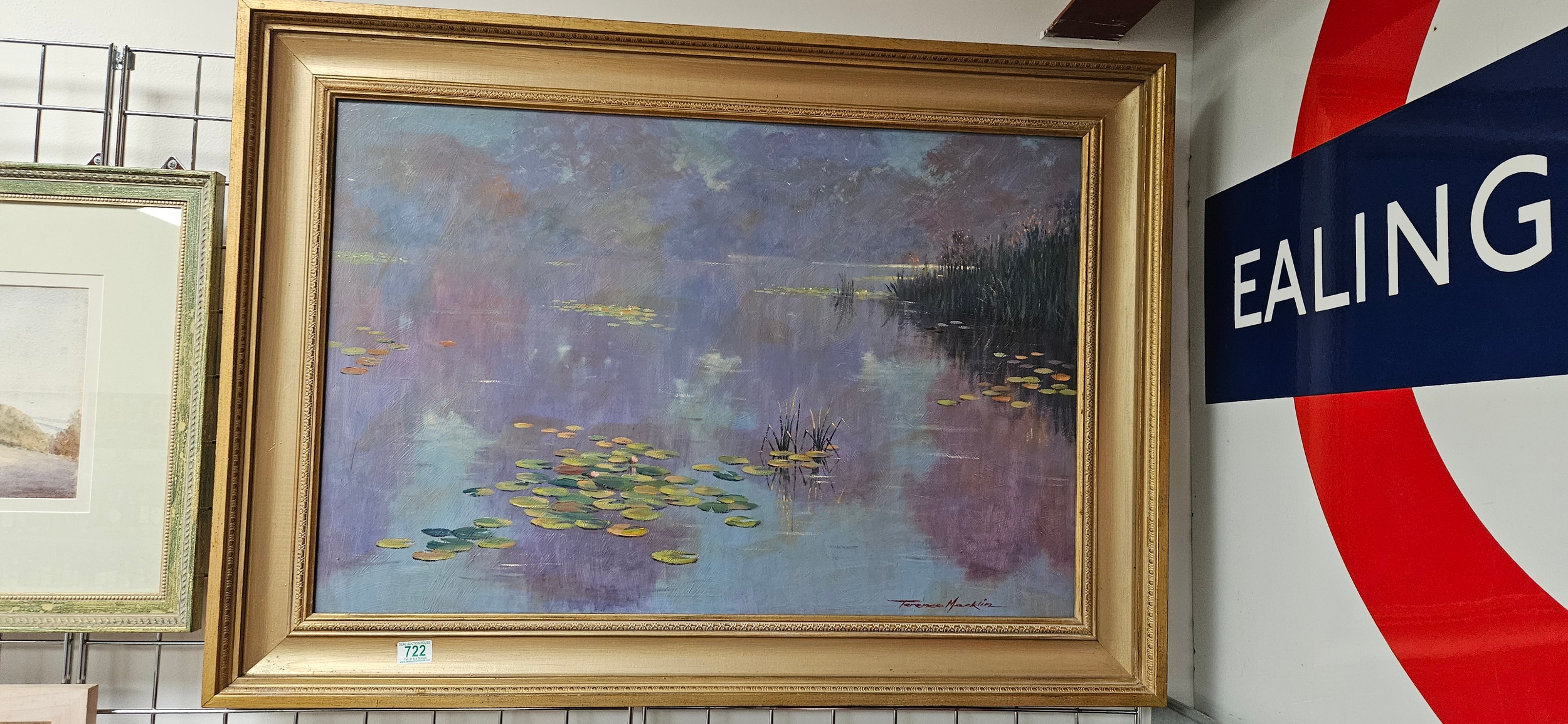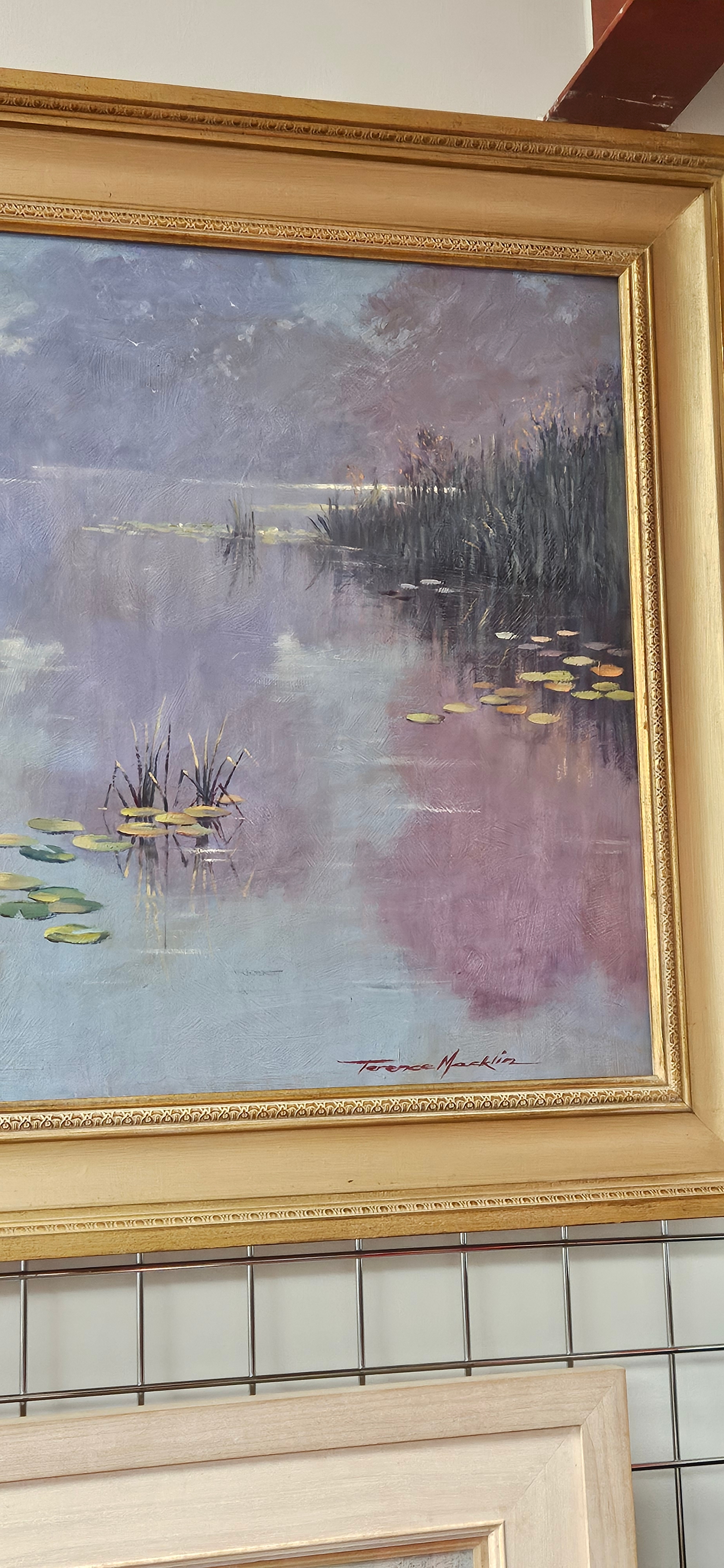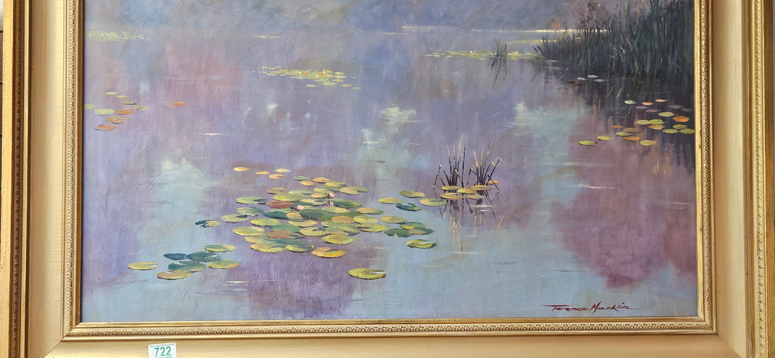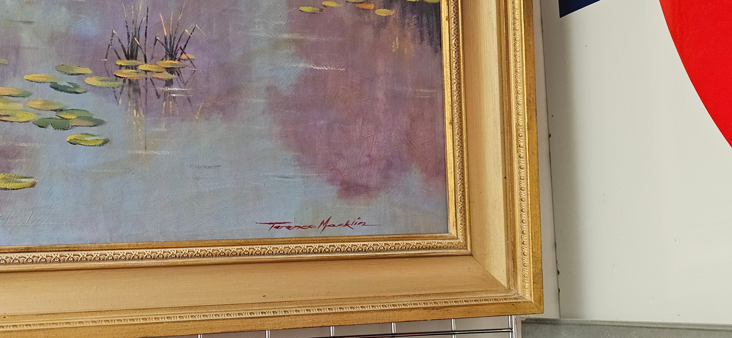 Large oil on board in gold frame of water lilies signed Terence Macklin