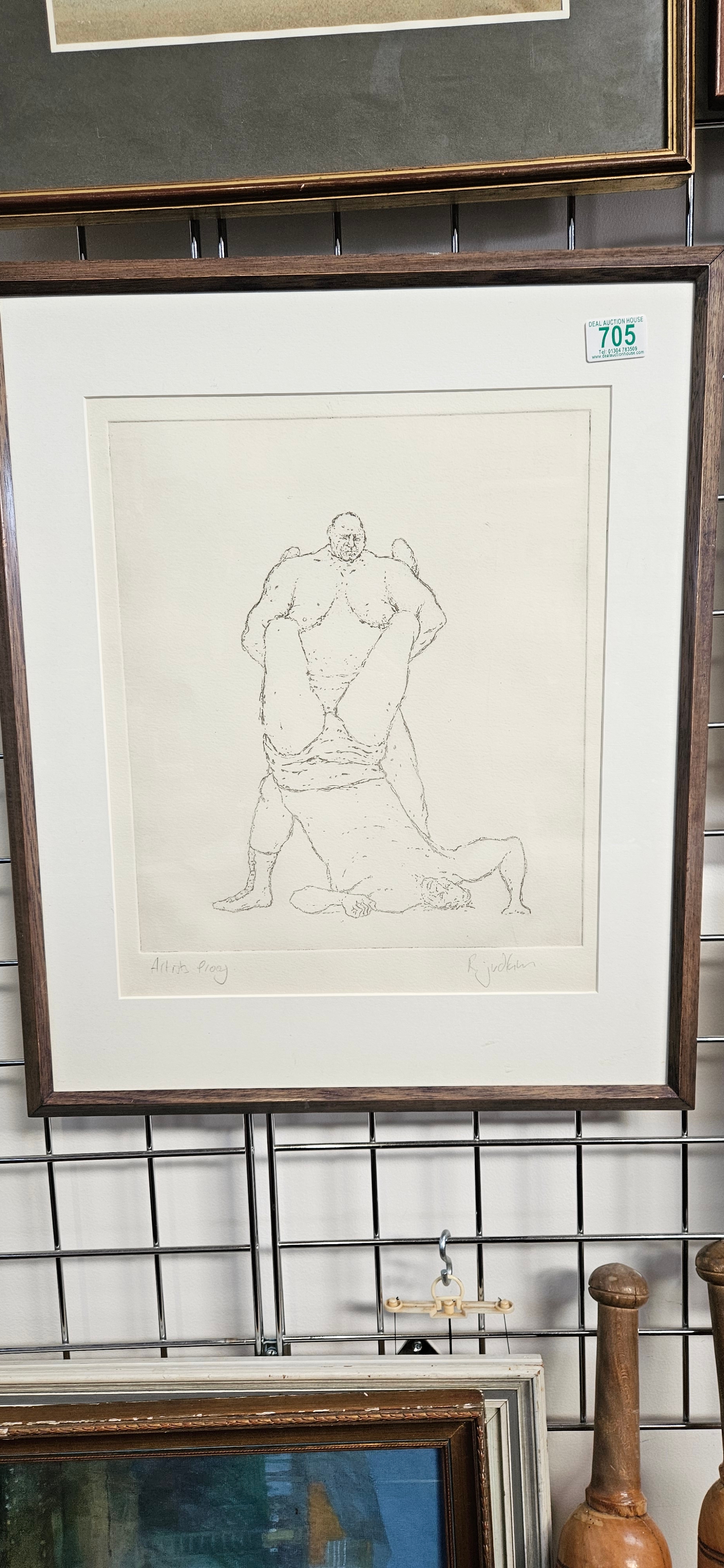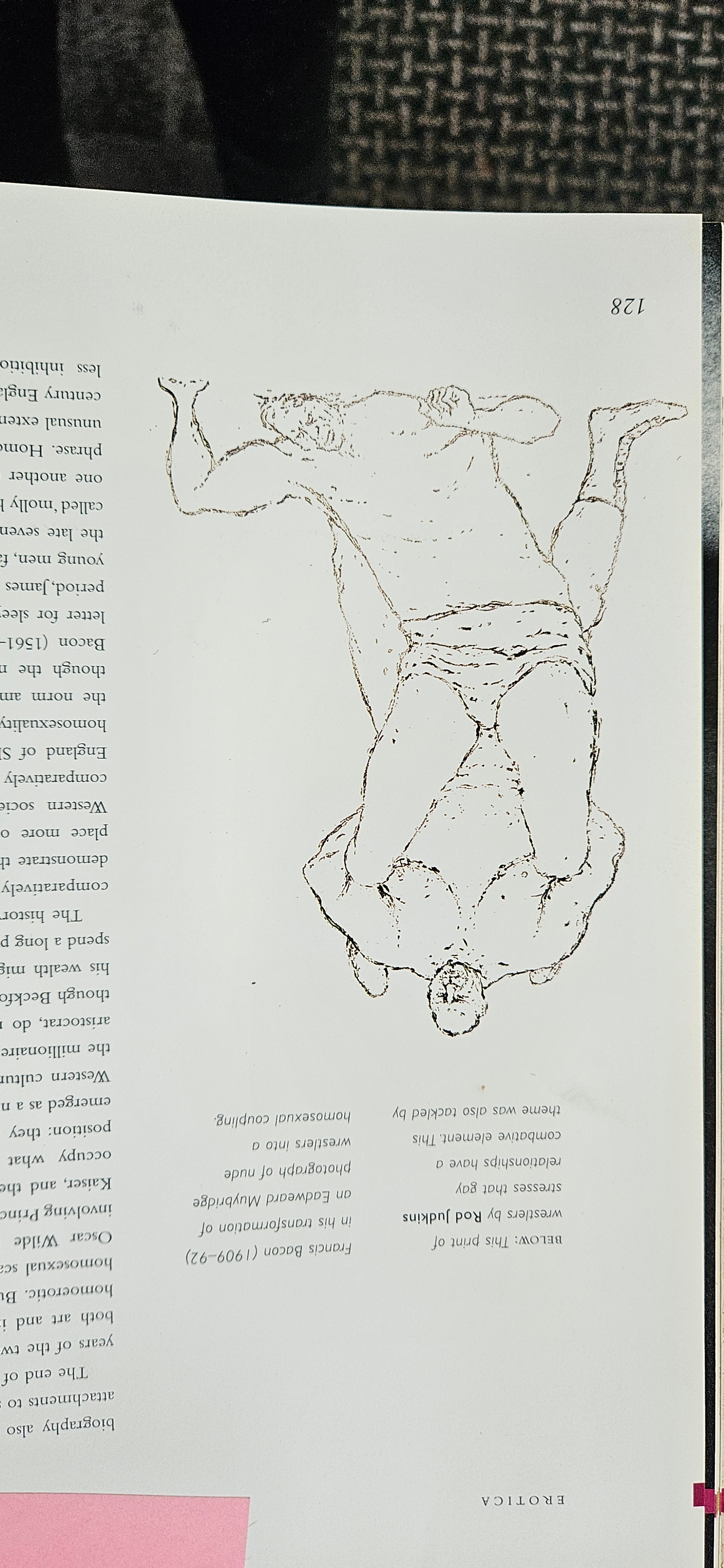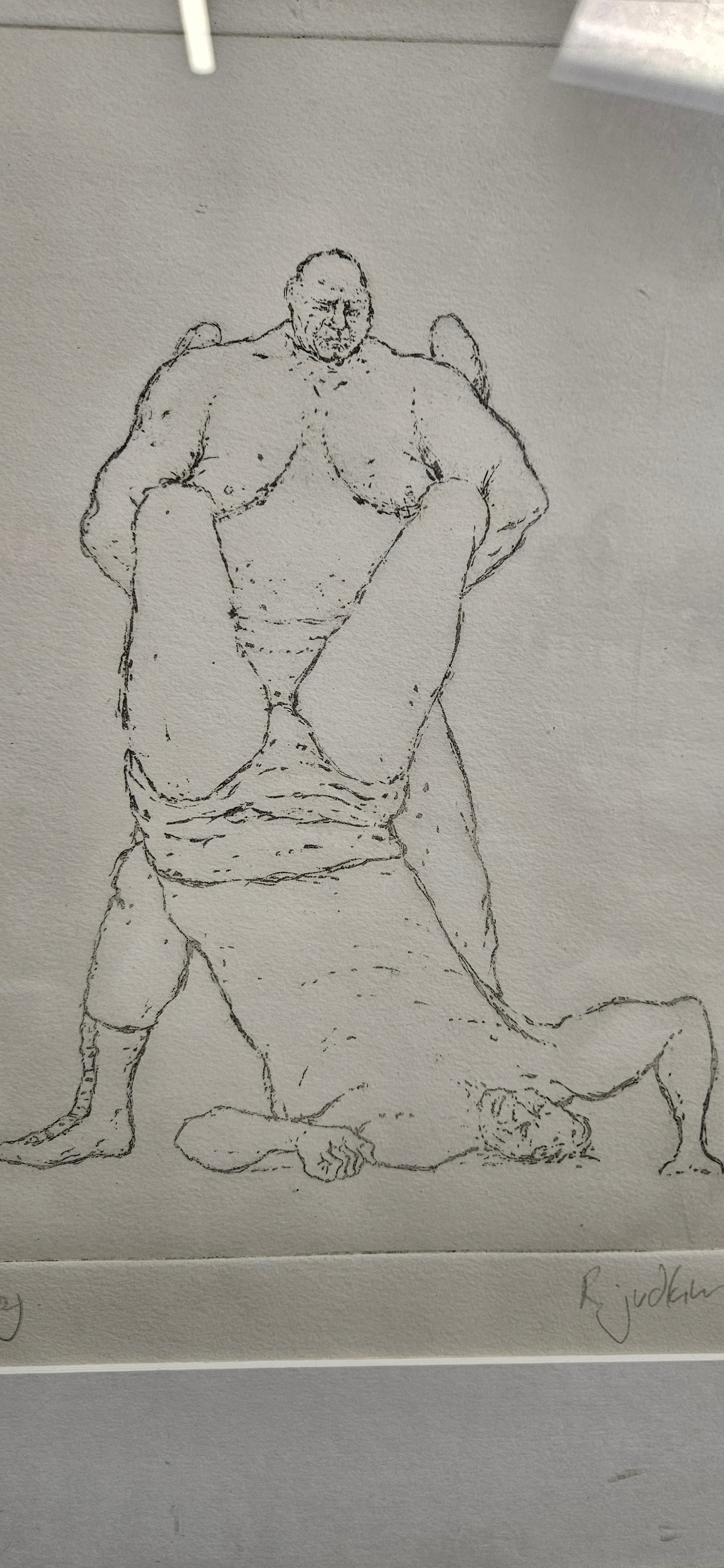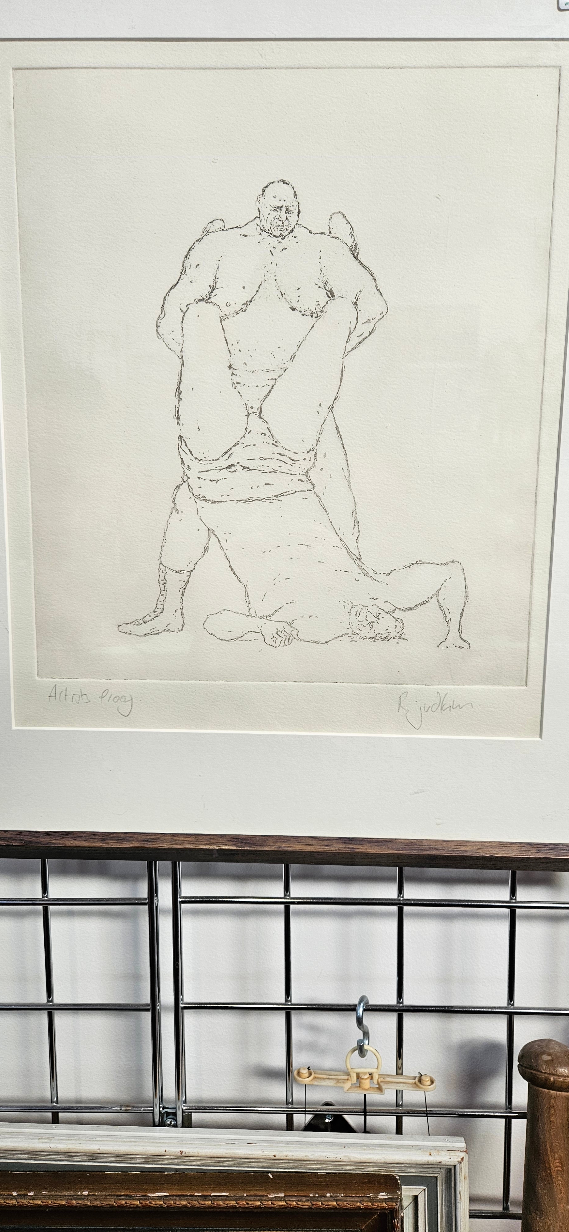 Rod Judkins signed artists proof of two male wrestlers with an Erotica book with references to homosexuality. This picture is featured in that book.
