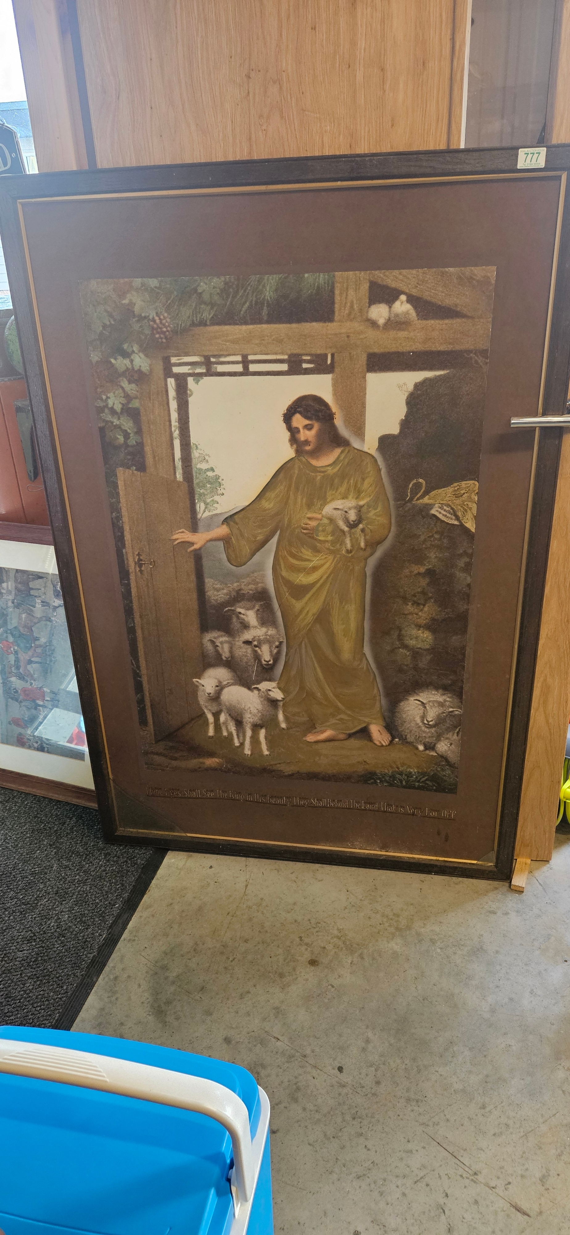 Antique religious print titled "The Tender Shepherd" by Charles Joseph Staniland – missing glass