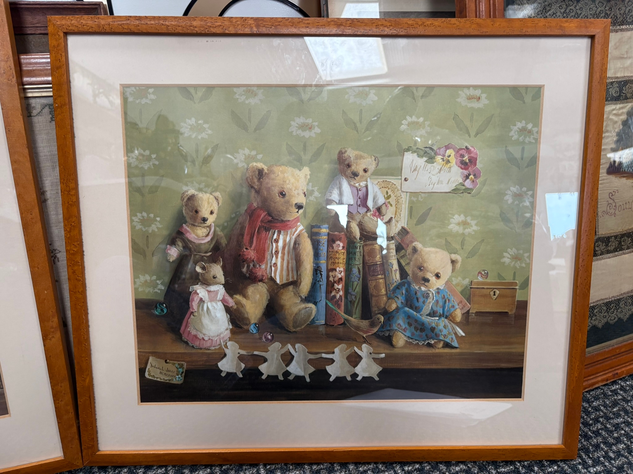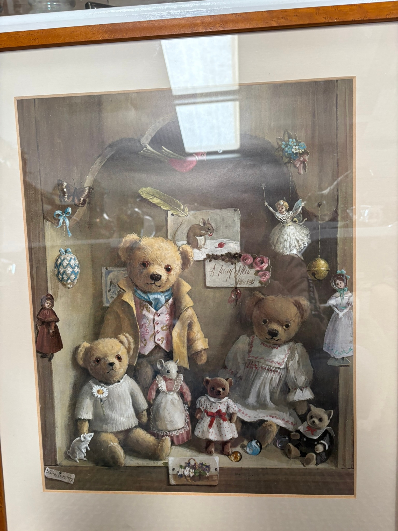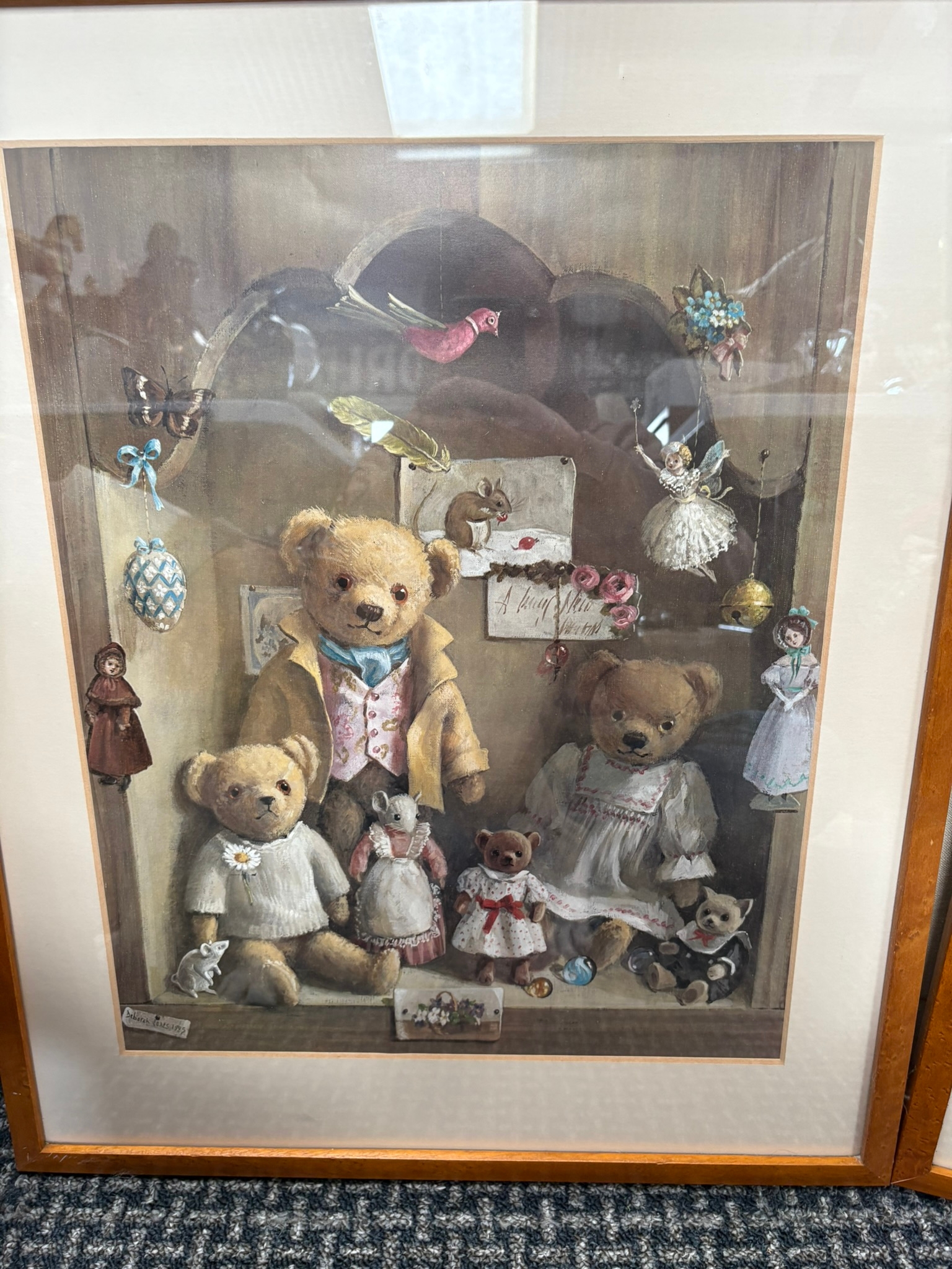 2 x Good quality prints of teddy bears in walnut veneer frames after Deborah Jones