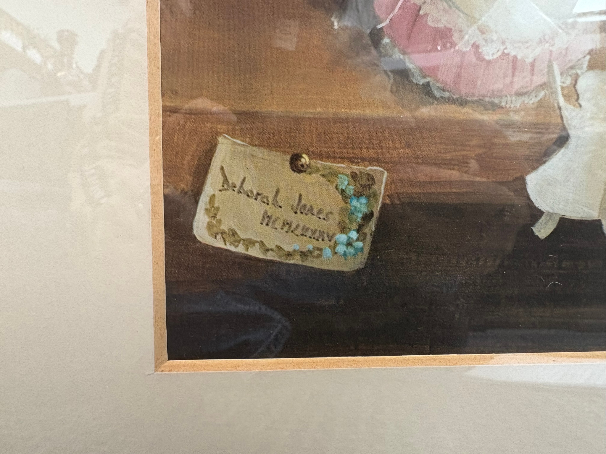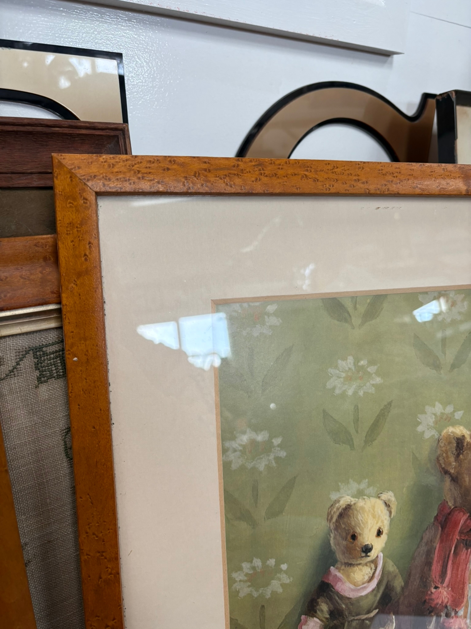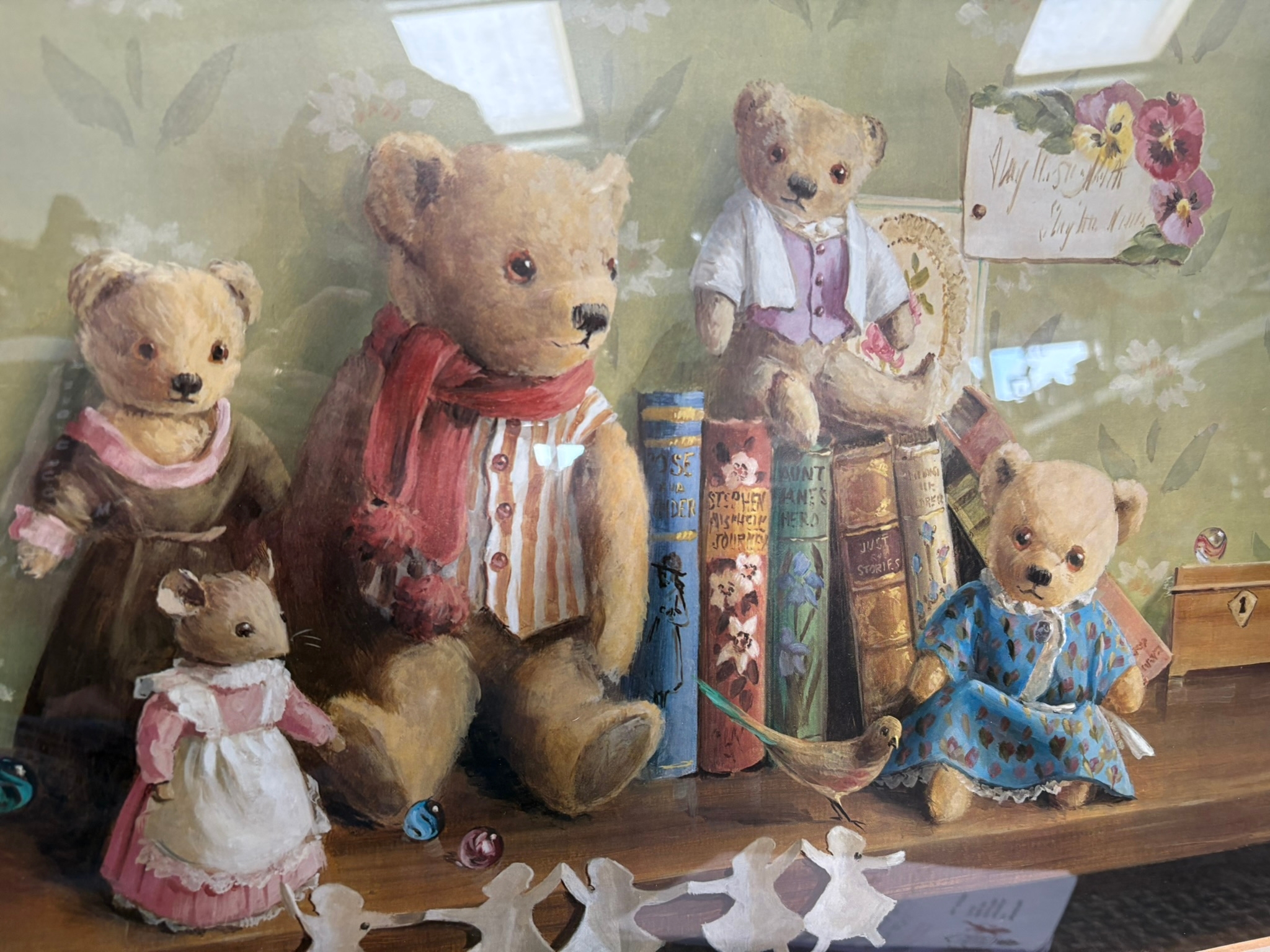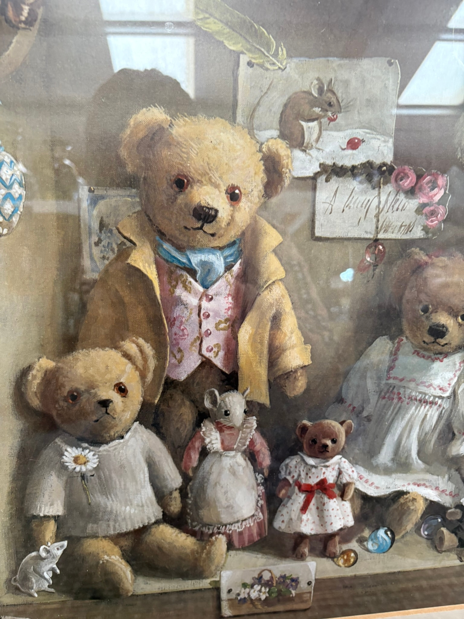 2 x Good quality prints of teddy bears in walnut veneer frames after Deborah Jones